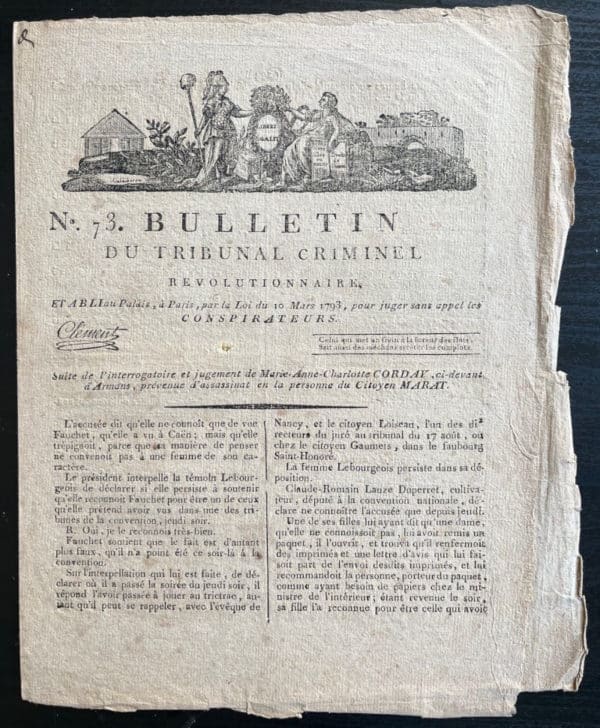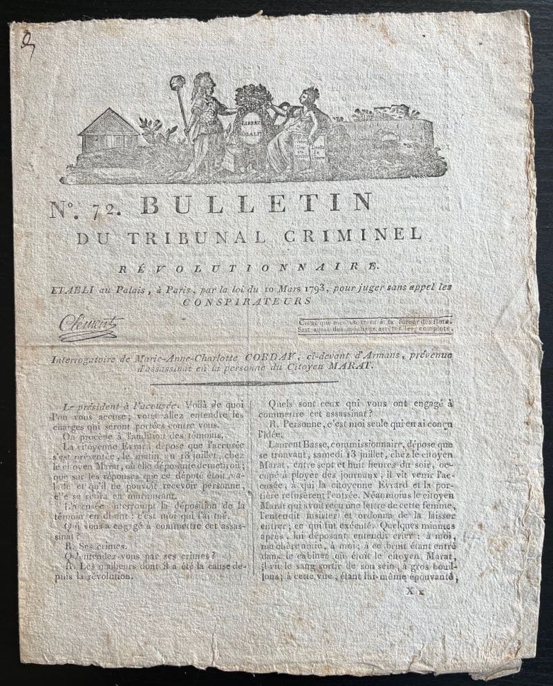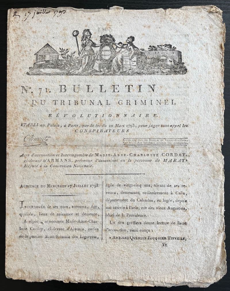 Rares et émouvants témoignage du procès de Charlotte Corday, suite à l’assassinat de Jean-Paul Marat le 13 juillet 1793, rapporté dans les bulletins du Tribunal criminel.