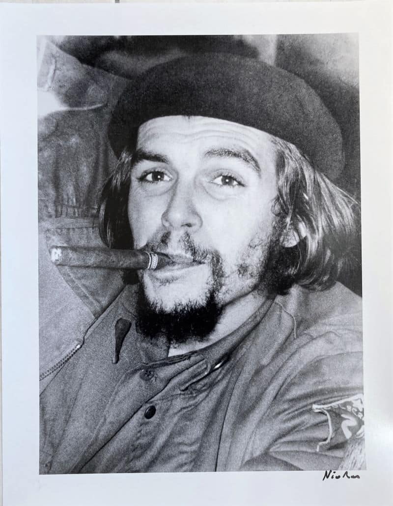 Ernesto GUEVARA (1928 – 1967), révolutionnaire marxiste et homme politique cubain, était connu pour être un grand amateur de cigares, comme son mentor Fidel Castro, qu’il découvrit à Cuba lors de la révolution de 1958. Cette photo signée par Nicolas Delgado a d’ailleurs été prise à cette époque, la photogénie du héros révolutionnaire, cigare aux lèvres, affublé de son célèbre béret sur lequel il avait épinglé son étoile de commandant reçu pour avoir mené victorieusement ses troupes à la victoire finale, a fait le tour du monde.