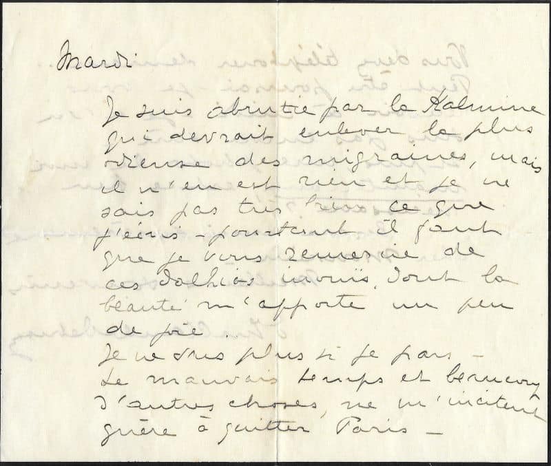 Emma Debussy migraineuse ne sait pas si elle pourra honorer son rendez-vous : « Je suis abrutie par la Kalmine qui devrait enlever la plus rieuse des migraines, mais il n’en est rien et je ne sais pas très bien ce que j’écris – pourtant il faut que je vous remercie de ces dahlias inouïs, dont la beauté m’apporte un peu de joie. Je sais plus si je pars – Le mauvais temps et beaucoup d’autres choses, ne m’incitent guère à quitter Paris – Vous devez téléphoner demain.. Peut être pourrai-je vous recevoir à midi – je n’en suis pas encore sûre – Et puis, une photo de moi maintenant est-ce bien nécessaire ? Encore merci sincèrement Monsieur… »