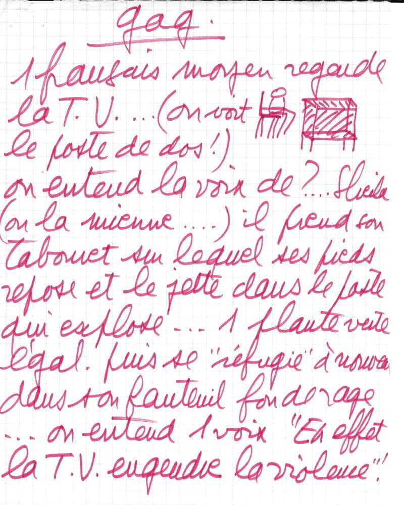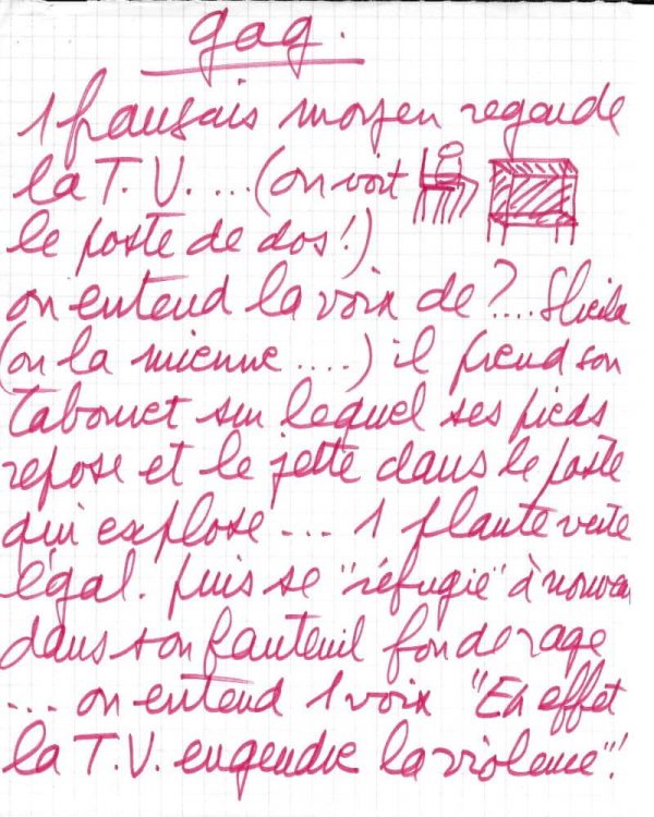 Feuillet 1 : « Gag. 1 français moyen regarde la T.V…. (on voit [dessin représentant une personne assise devant sa télévision] le poste de dos !). On entends la voix de ?…Sheila (ou la mienne….) il prend son tabouret sur lequel ses pieds repose et le jette dans le poste qui explose…1 plante verte égal. puis se « réfugie » à nouveau dans son fauteuil fou de rage…on entend 1 voix « En effet la T.V. engendre la violence » ! »