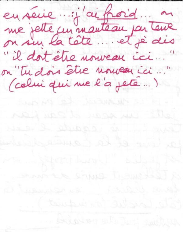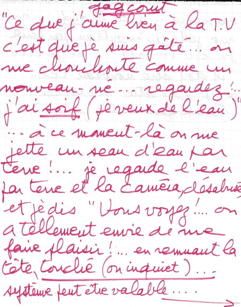 Feuillet 2 : « Gag court « Ce que j’aime bien à la T.V c’est que je suis gâté…on me chuchote comme un nouveau-né…regardez !..j’ai soif (je veux de l’eau)…) à ce moment-là on me jette un seau d’eau par terre !…je regarde l’eau par terre et la caméra, désabusé, et je dis « Vous voyez !…on a tellement envie de me faire plaisir !…en remuant la tête, touché (ou inquiet)…système peut être valable….en série….j’ai froid…on me jette un manteau par terre ou sur la tête….et je dis « il doit être nouveau ici… » ou « tu dois être nouveau ici… » (celui qui me l’a jeté…) »