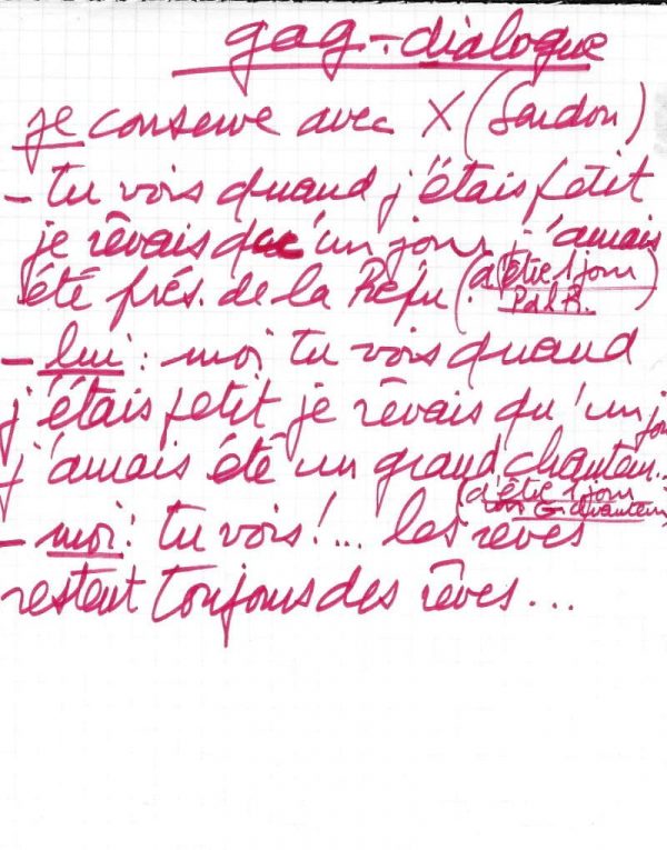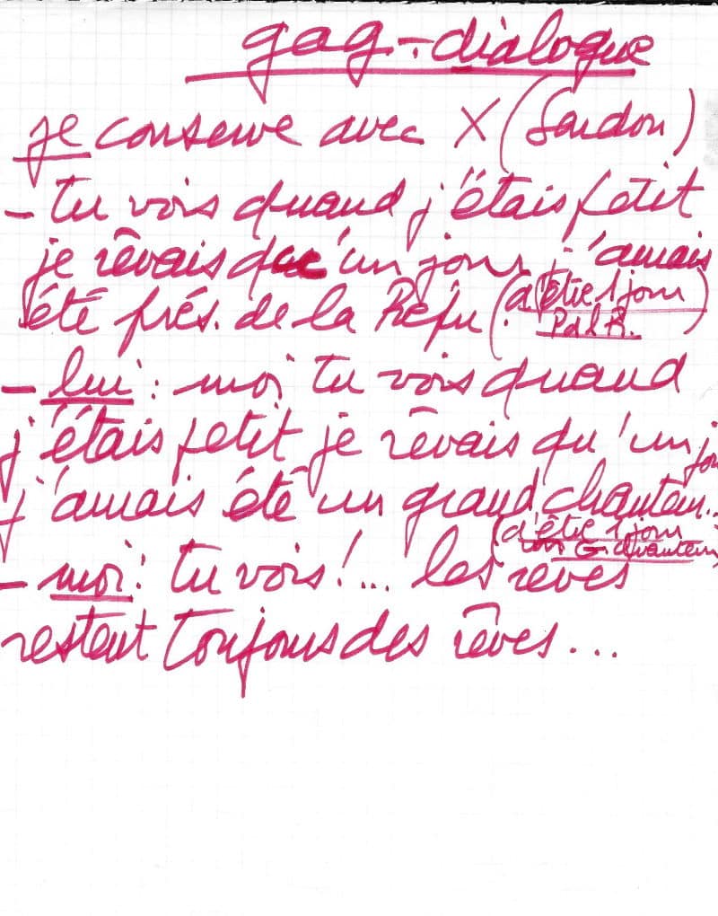 Manuscrit de travail d’un dialogue imaginé avec le chanteur Michel Sardou :