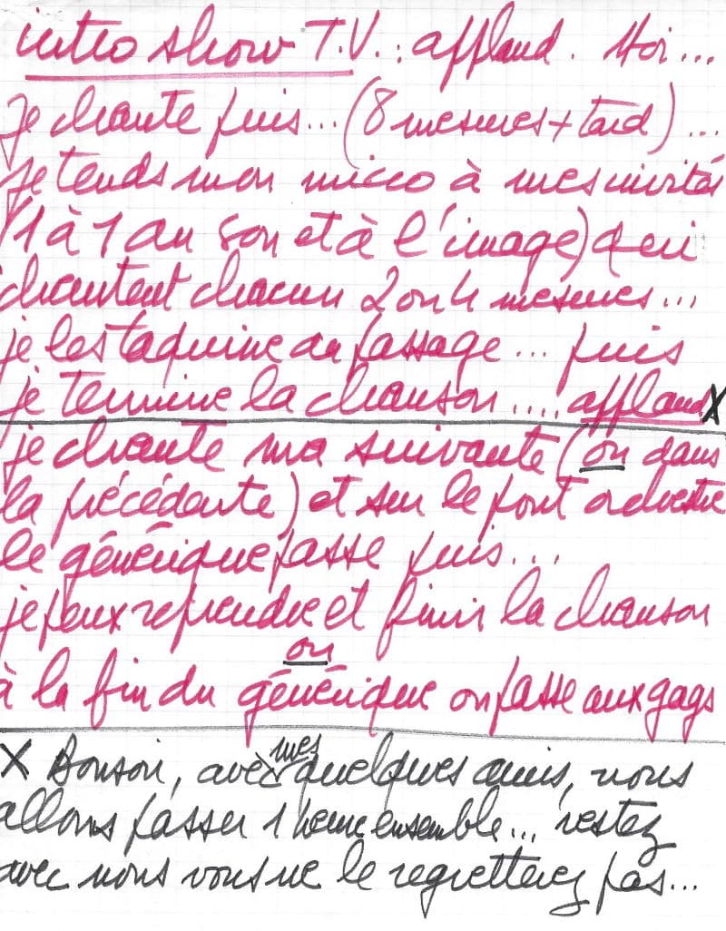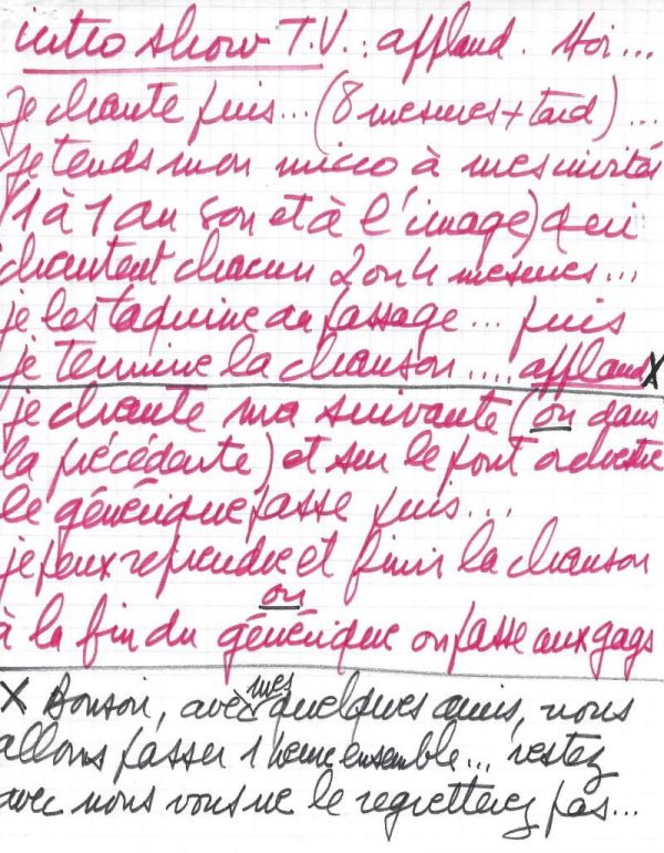 Manuscrit de travail partiel destiné à un show télévisé consacré au chanteur : rédaction des différentes étapes qui introduisent Claude François et ses invités, des dialogues : « intro show T.V. : applaud. Moi…Je chante puis…(8 mesures tard)…Je tends mon micro à mes invités (1 à 1 au son et à l’image) qui chantent chacun 2 ou 4 mesures…Je les taquine au passage…puis je termine la chanson…applau x Je chante ma suivante (ou dans la précédente) le générique passe puis…Je peux reprendre et finir la chanson ou à la fin du générique on passe aux gags – x Bonsoir, avec mes quelques amis, nous allons passer 1 heure ensemble…restez avec nous vous ne le regretterez pas… »