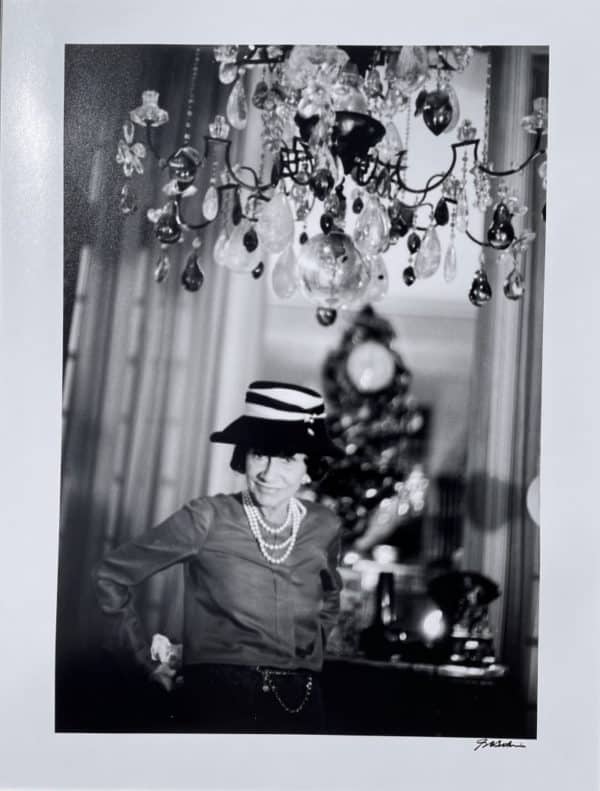 Photographie de Coco Chanel sous un superbe lustre dans sa suite à l’hôtel Ritz de Paris en 1963.