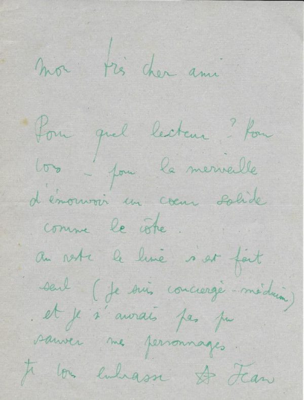 Cocteau lui adresse son livre : « Pour quel lecteur ? Pour vous – pour la merveille d’émouvoir un cœur solide comme le vôtre. Au reste le livre s’est fait seul (je suis concierge – médecin) et je n’aurais pas pu sauver mes personnages… »