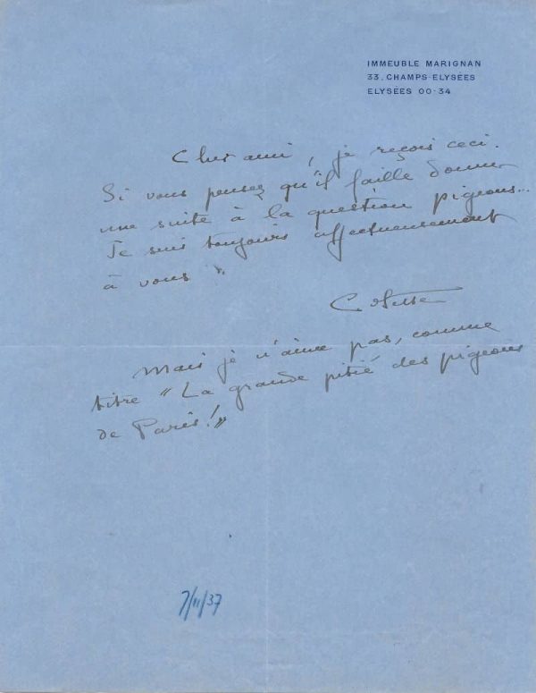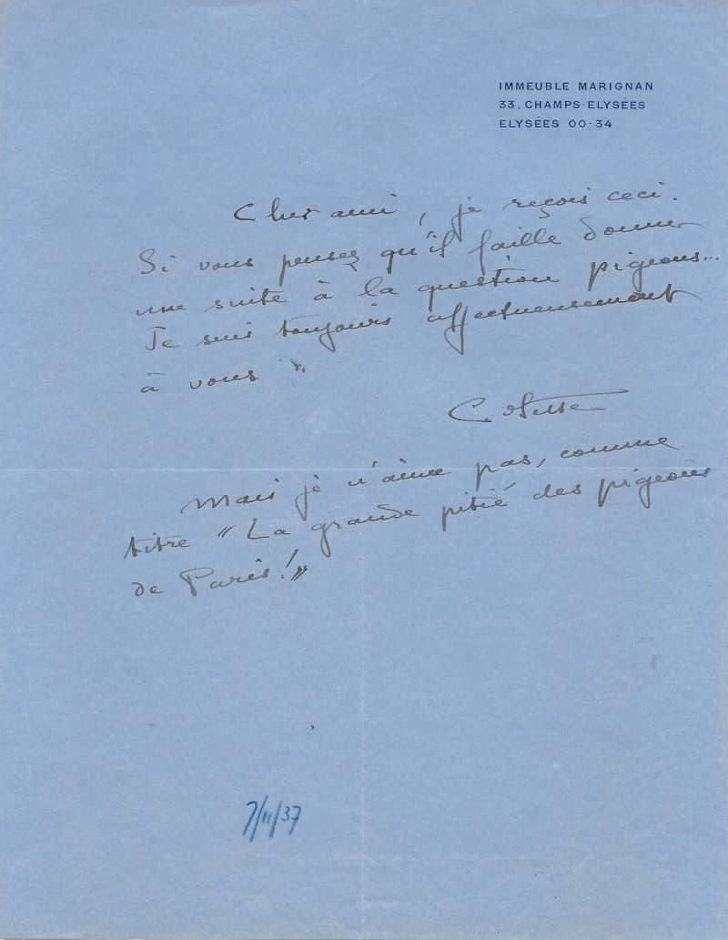 Lettre amusante : « Cher ami, je reçois ceci. Si vous pensez qu’il faille donner une suite à la question pigeons… Je suis toujours affectueusement à vous » Colette Mais je n’ai pas, comme titre « La grande pitié des pigeons de Paris ! « »
