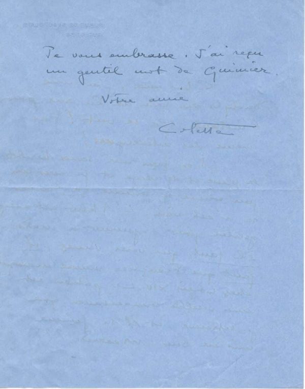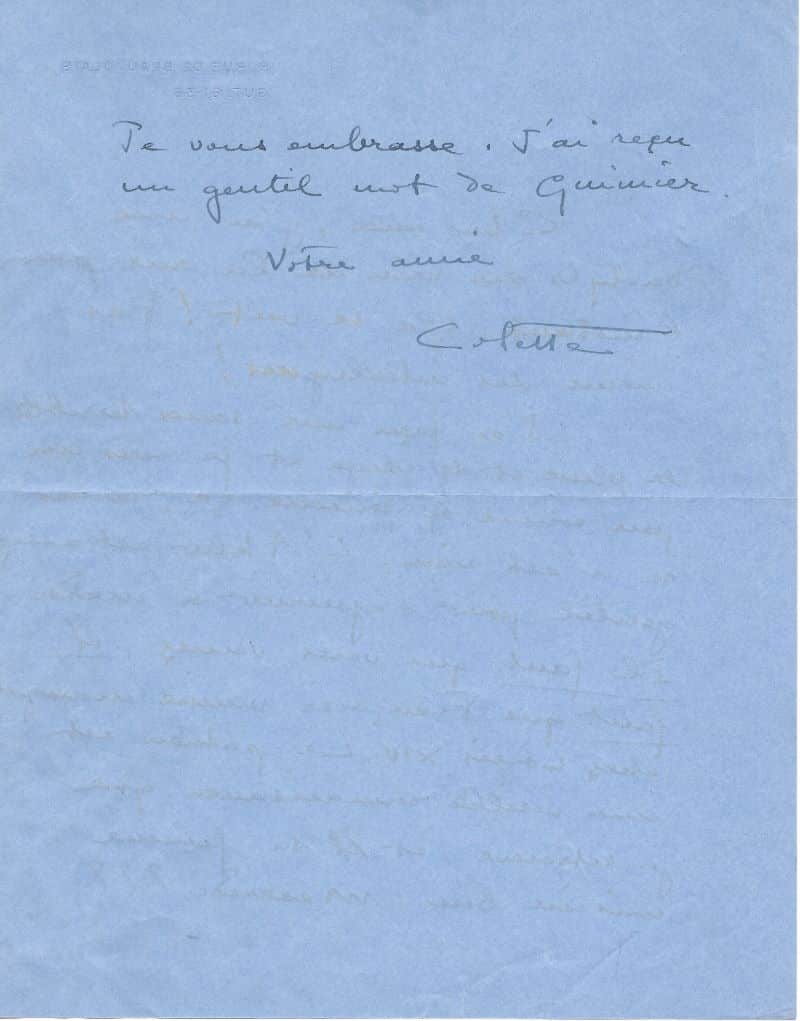 Colette donne de ses nouvelles : « Cher ami, j’ai une dactylo du coin de la rue pour l’instant. Ça se voit ! Pas même des interlignes ! J’ai reçu une sauce terrible de pluie et de neige et je suis un peu comme ci comme ça, mais ce n’est rien. L’Atelier est assez gentil pour s’ajourner à mardi. Il faut que vous veniez, il faut que Françoise vienne manger chez Louis XIV. Le patron est une veille connaissance que je retrouve, et sa femme cuisine bien. Mercredi ??? Je vous embrasse. J’ai reçu un gentil mot de Guimier… »