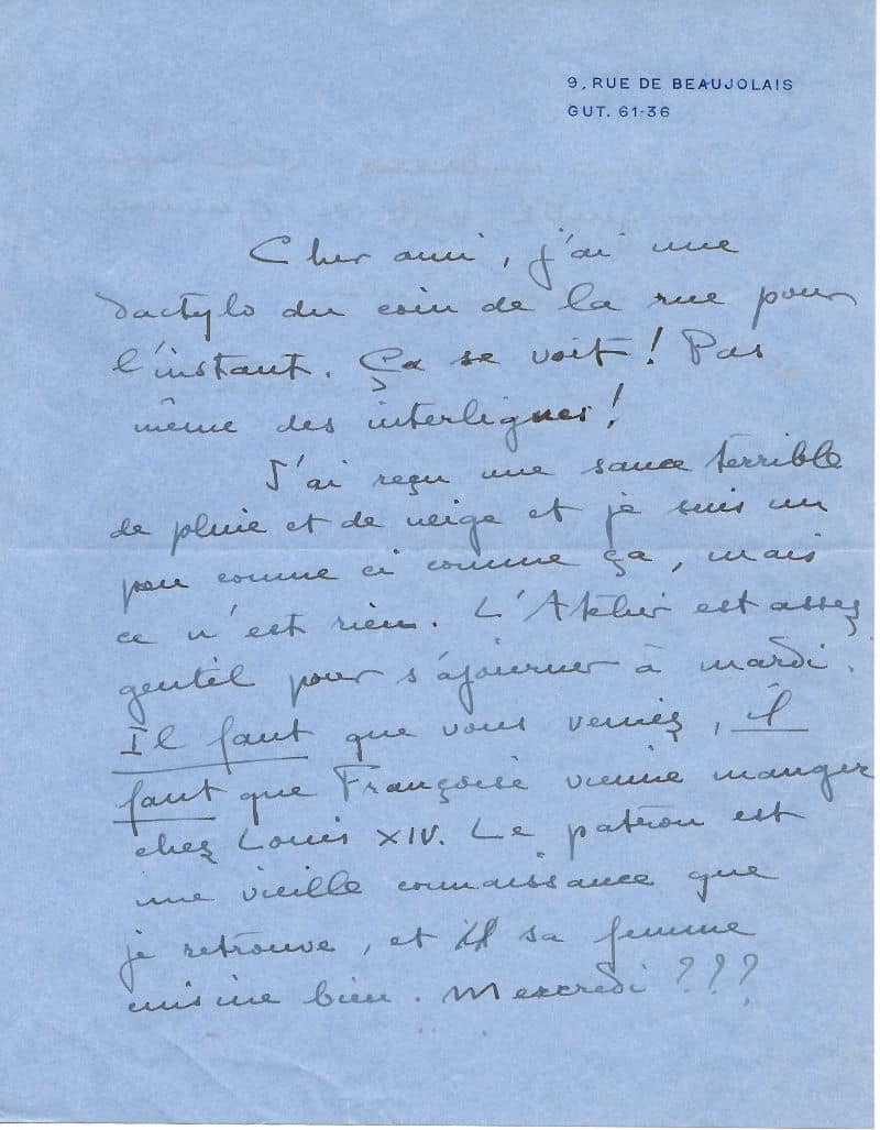 Colette, alitée, donne des nouvelles sur l’actualité théâtrale : « Cher ami, comme dit mon charmant médecin le Dc Moreau, « on ne va pas dans le midi pour sept jours, on y va pour un mois, ou pas du tout ! » La preuve qu’il a raison, c’est que je suis couchée depuis vendredi dernier, et une température qui n’a voulu céder que ce matin. Elle m’attendait, tapie dans les antiques poussières de la Porte Saint Martin. On a voulu me consoler en me disant que mon « Spectacle » était bien… Par chance, L’appartement de Zoïka [L’Appartement de Zoïka est un livre de Mikhaïl Boulgakov] est remis à lundi soir. Mais cette semaine, je n’ai rien à vous envoyer, n’ayant pas la permission ni l’envie – de quitter ma chambre. N’en veuillez pas à votre vieille amie ! Il y a à l’Odéon une Eugénie Grandet qu’il vaudrait mieux noyer avec son auteur, je connais la pièce. Mais j’aurais aimé un petit spectacle classique du Michel. Vous ne voulez pas fêter ma guérison la semaine prochaine ? Dîner, déjeuner chez un bistrot avec nôtre Françoise ? Mardi, mercredi, jeudi ? Parlez, et tendez votre joue à Colette »