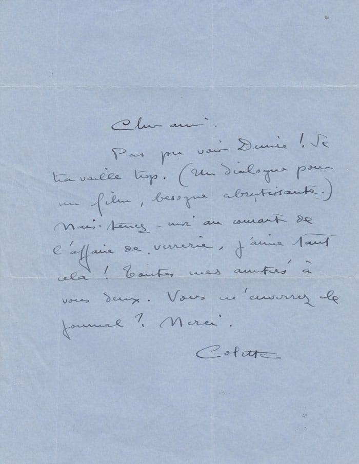«Pas pu voir Denise ! Je travaille trop. (Un dialogue pour un film, besogne abrutissante.) Mais tenez-moi au courant de l’affaire de verrerie, j’aime tant cela ! Toutes mes amitiés à vous deux. Vous m’enverrez le journal ? Merci. »