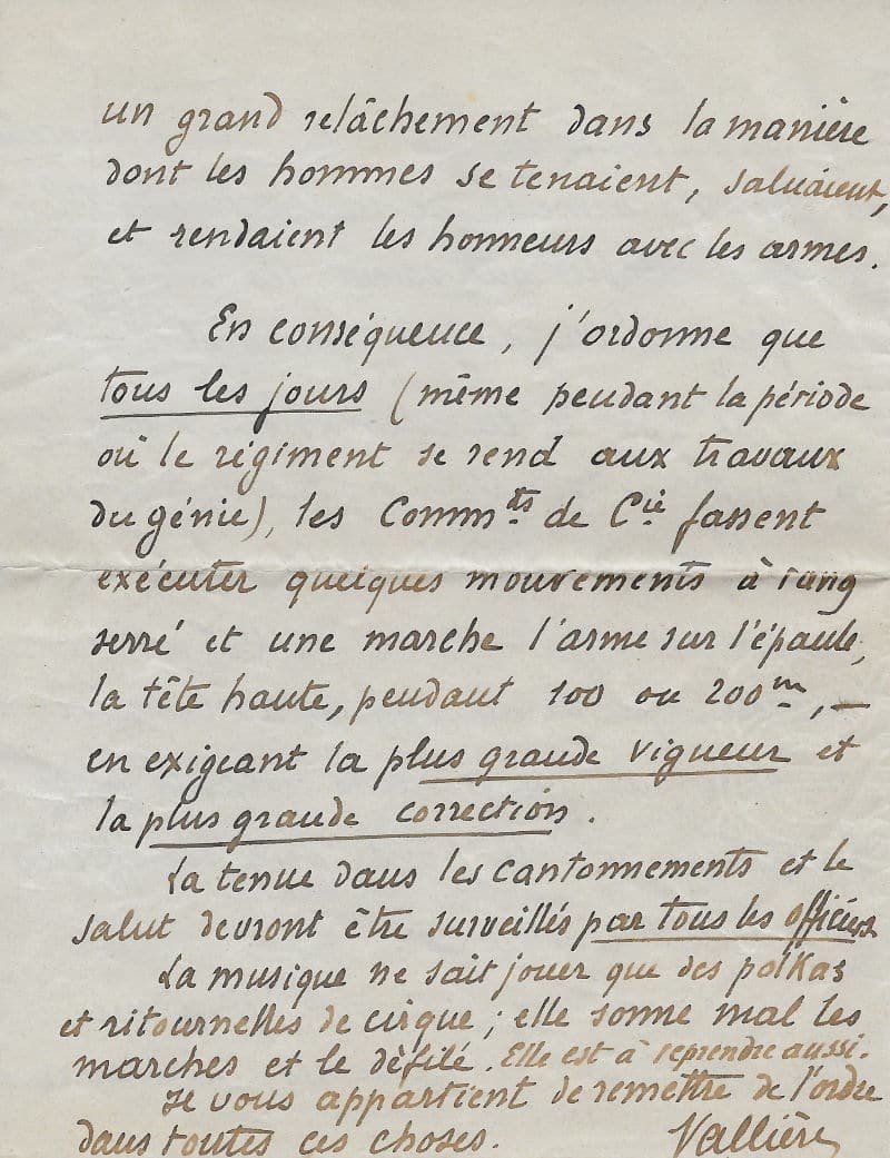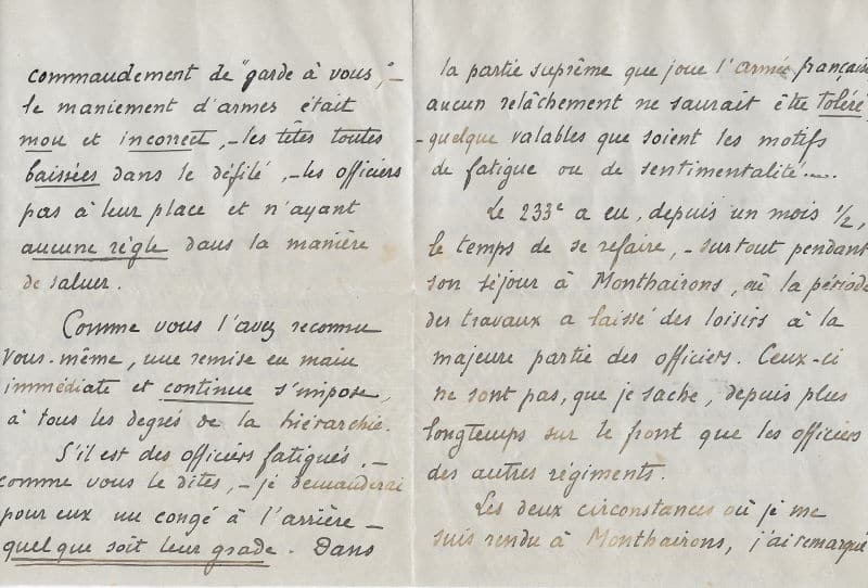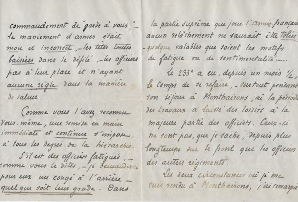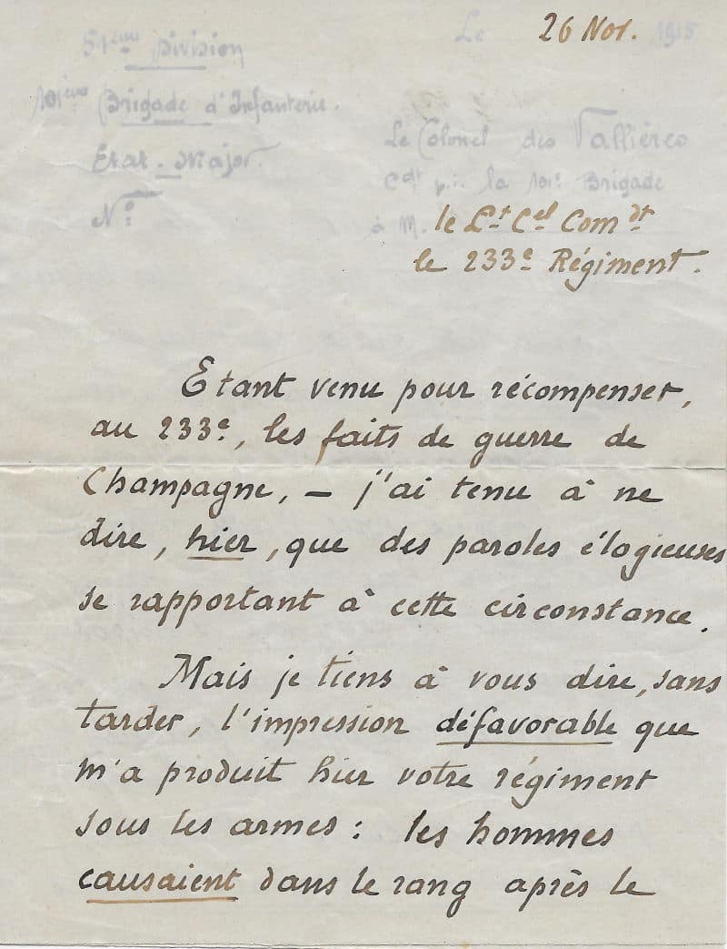 Terrible lettre du jeune promu, le colonel Vallières, à l’encontre de l’unité du colonel Hepp, après sa venue suite au début de la bataille de Champagne. Selon lui, les soldats ne répondent pas aux exigences des règles de l’armée française dans un moment capitale du conflit : « Etant venu pour récompenser, au 233e, les faits de guerre de Champagne, – j’ai tenu à ne dire, hier, que des paroles élogieuses se rapportant à cette circonstance. Mais je tiens à vous dire, sans tarder, l’impression défavorable que m’a produit hier votre régiment sous les armes : les hommes causaient dans le rang après le commandement de « garde à vous », le maniement d’armes était mou et incorrect, les têtes toutes baissées dans le défilé ; les officiers pas à leur place et n’ayant aucune règle dans la manière de saluer. Comme vous l’avez reconnu vous-même, une remise en main immédiate et continue s’impose à tous les degrés de la hiérarchie. S’il est des officiers fatigués, comme vous le dites, je demanderai pour eux un congé à l’arrière quelque soit leur grade. Dans la partie suprême que joue l’armée française, aucun relâchement ne saurait être toléré, quelque valables que soient les motifs de fatigue ou de sentimentalité… Le 233e a eu, depuis un mois ½, le temps de se refaire, surtout pendant son séjour à Monthairons, où la période des travaux a laissé des loisirs à la majeure partie des officiers. Ceux-ci ne sont pas, que je sache, depuis plus longtemps sur le front que les officiers des autres régiments. Les deux circonstances où je me suis rendu à Monthairons, j’ai remarqué un grand relâchement dans la manière dont les hommes se tenaient, saluaient, et rendaient les honneurs avec les armes. En conséquence, j’ordonne que tous les jours (même pendant la période où le régiment se rend aux travaux du génie), les Commts de Cie fassent exécuter quelques mouvements à rang serré et une marche l’arme sur l’épaule, la tête haute, pendant 100 ou 200m, en exigeant la plus grande vigueur et la plus grande correction. La tenue dans les cantonnements et le salut devront être surveillés par tous les officiers. La musique ne sait jouer que des polkas et ritournelles de cirque ; elle sonne mal les marches et le défilé. Elle est à reprendre aussi. Il vous appartient de remettre de l’ordre dans toutes ces choses… »
