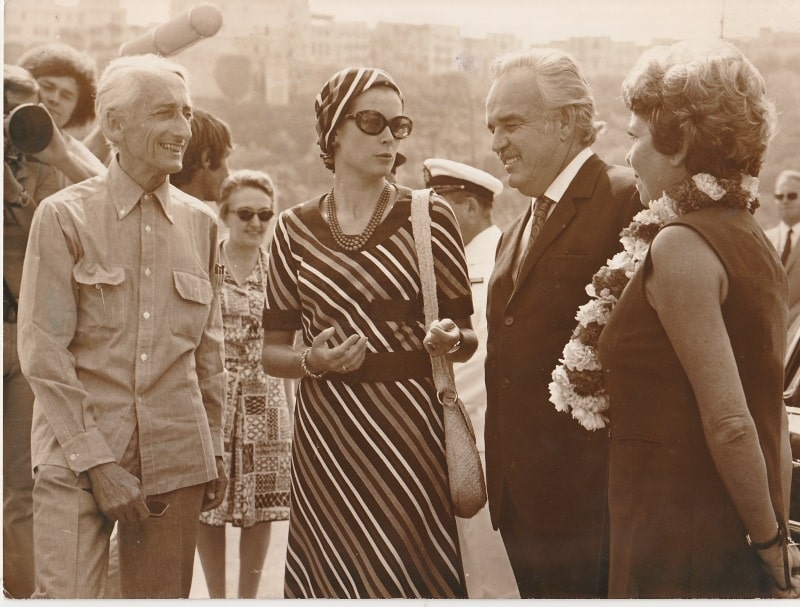 Photo de 1970 du commandant Cousteau et de sa femme accueilli par le prince Rainier et la princesse Grace au port de Monaco suite à un long périple de 250 000 km sur 3 ans et demi à bord de la Calypso.