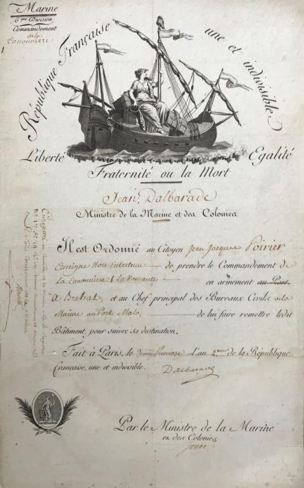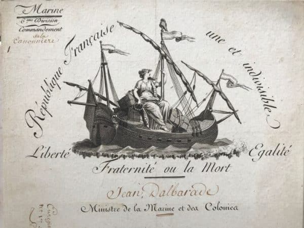 Document signé du ministre de la marine Jean Dalbarade. Paris le 30 pluviôse an 2 (18 février 1794) ; 1 page in-folio sur carton avec vignette de la Marine et des Colonies de la République, et sa devise : « Liberté, Egalité, Fraternité ou la Mort ».