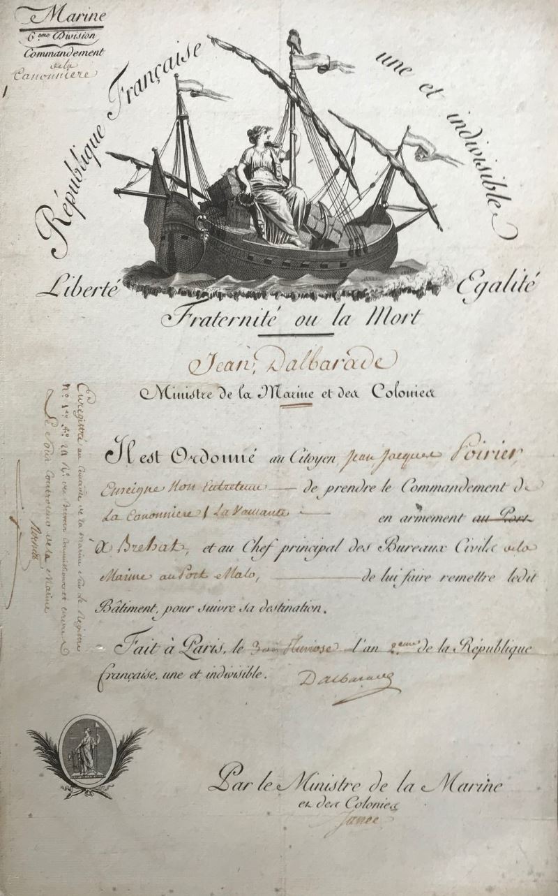 Jean Dalbarade, ministre de la marine et des colonies, ordonne au citoyen Jean-Jacques Poirier : « de prendre le commandement de la canonnière La Vaillante en armement à Brehat, et au chef principal des bureaux civils et la marine au port Malo de lui faire remettre le bâtiment pour suivre sa destination. »