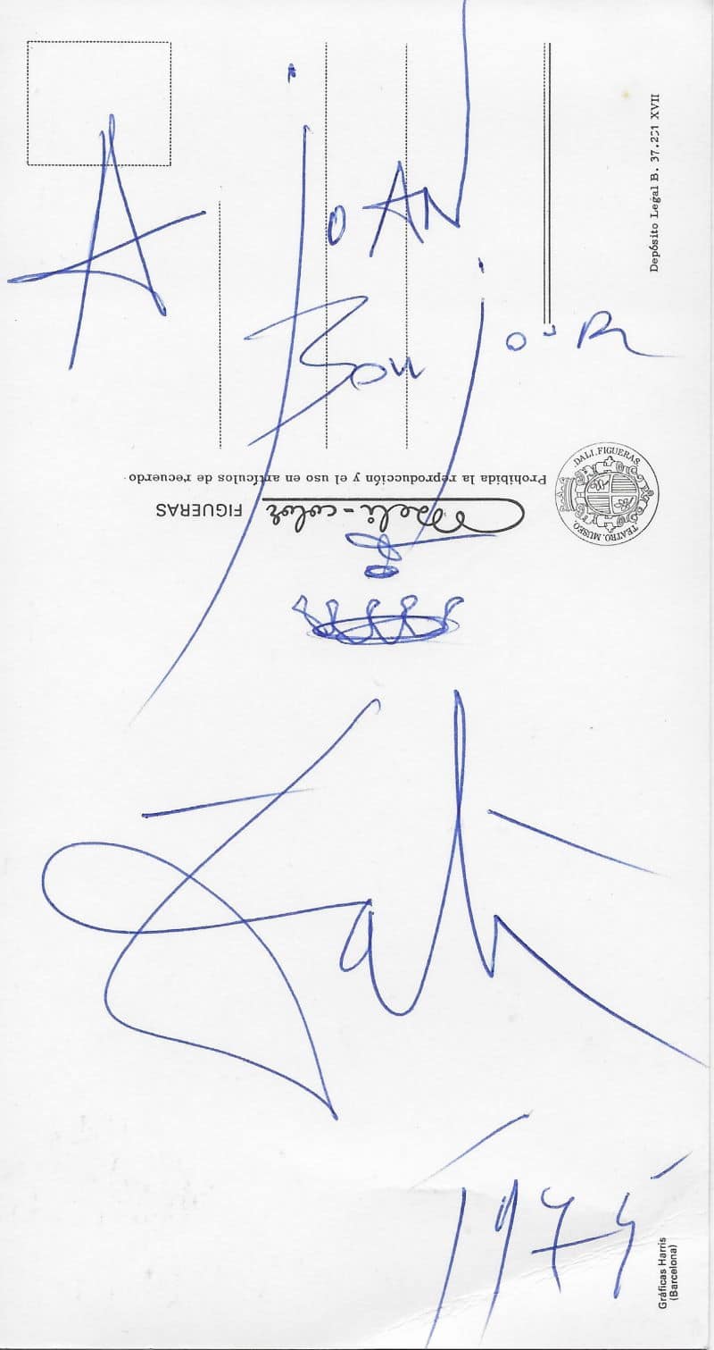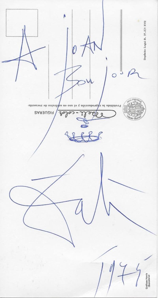 Dédicace « A Joan » signée, avec une petite couronne, et datée (1975) au stylo, au dos d’une carte postale, 10,5 x 19,5 cm. Cette carte postale a été diffusée en septembre 1974, en l’honneur de l’inauguration du musée Dali du 28 octobre 1974.