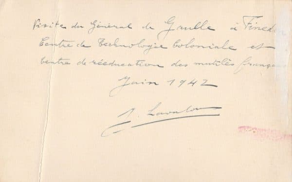 -Rare photographie d’époque du général de Gaulle, durant la guerre, en visite à Finedon en Angleterre, centre de technologie coloniale et centre de rééducation des mutilés français en juin 1942 (mention manuscrite au dos).
