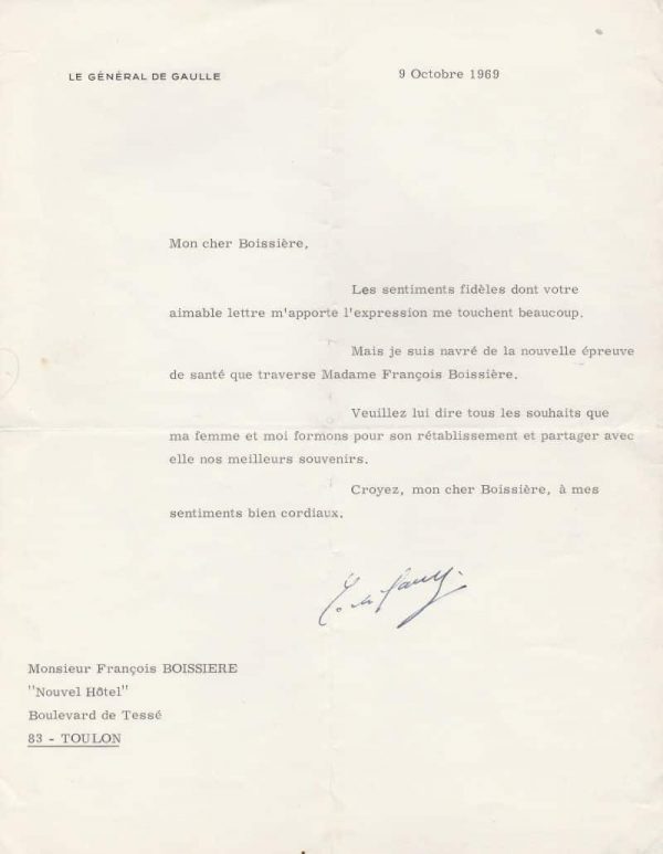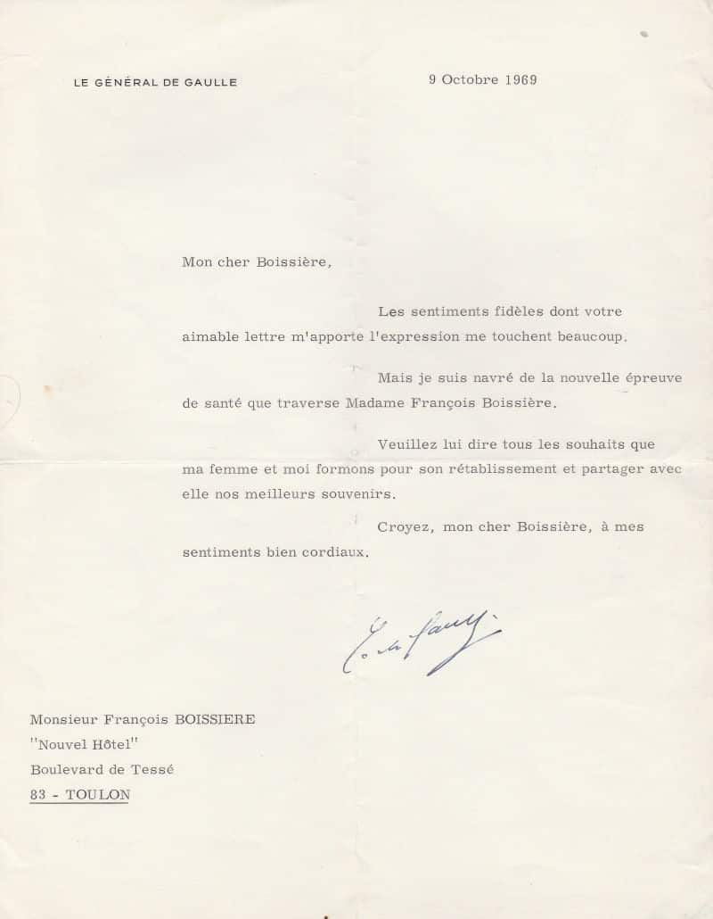 Le Général de Gaulle remercie la fidélité de son ami alors qu’il vient de renoncer à son mandat de Président le 28 avril 1969, il meurt un an après : « Les sentiments fidèles dont votre aimable lettre m’apport l’expression me touchent beaucoup. Mais je suis navré de la nouvelle épreuve de santé que traverse Madame François Boissière. Veuillez lui dire tous les souhaits que ma femme et moi formons pour son rétablissement et partager avec elle nos meilleurs souvenirs…»