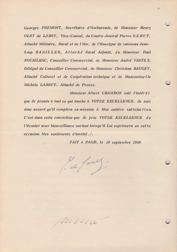Le Général de Gaulle remercie la fidélité de son ami alors qu’il vient de renoncer à son mandat de Président le 28 avril 1969, il meurt un an après : « Les sentiments fidèles dont votre aimable lettre m’apport l’expression me touchent beaucoup. Mais je suis navré de la nouvelle épreuve de santé que traverse Madame François Boissière. Veuillez lui dire tous les souhaits que ma femme et moi formons pour son rétablissement et partager avec elle nos meilleurs souvenirs…»