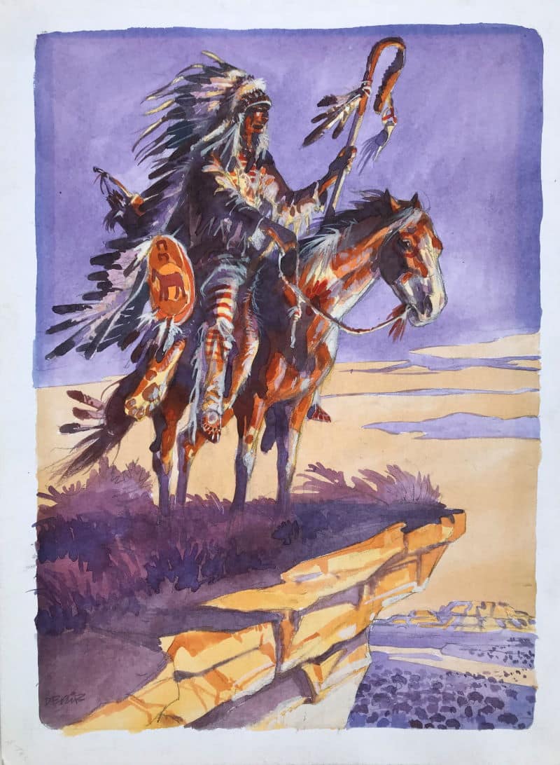 Gouache sur papier à dessin représentant un chef sioux, 29 x 40 cm. Signé en bas à gauche.