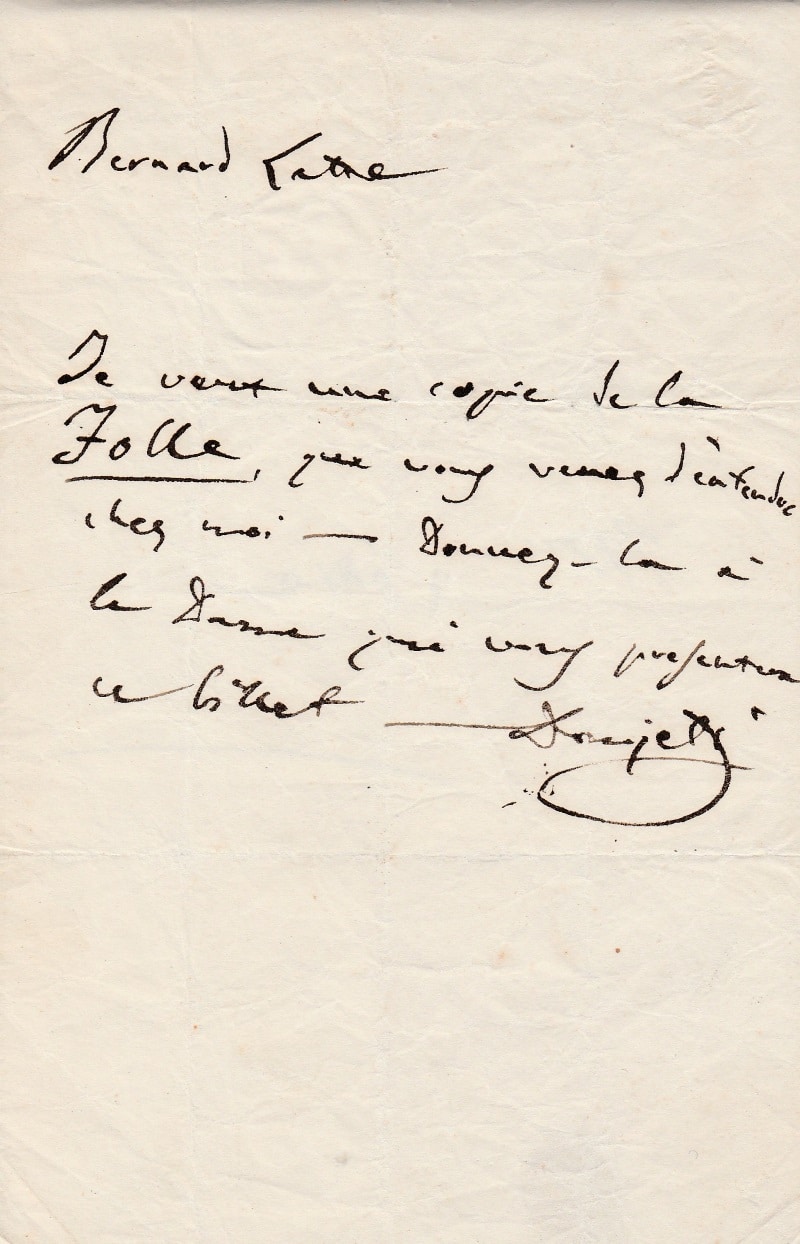 Cette lettre doit certainement faire référence à l’oeuvre pour chant et piano « La folle de Sainte-Hélène » (« La pazza di Santa Helena ») de 1841, composition de Gaetano Donizetti sur un texte du tenor Adolphe Nourrit