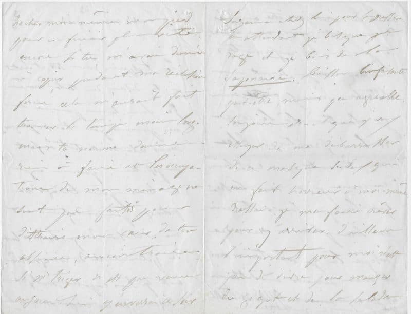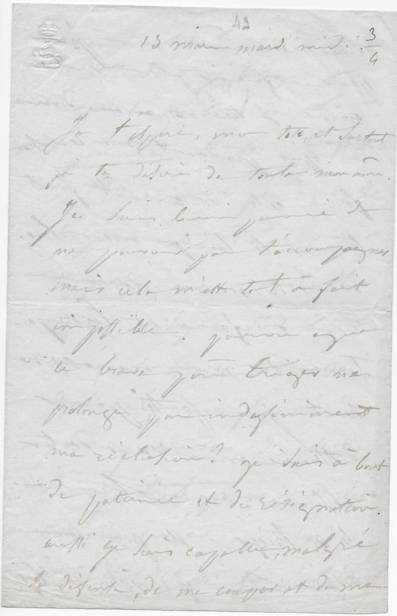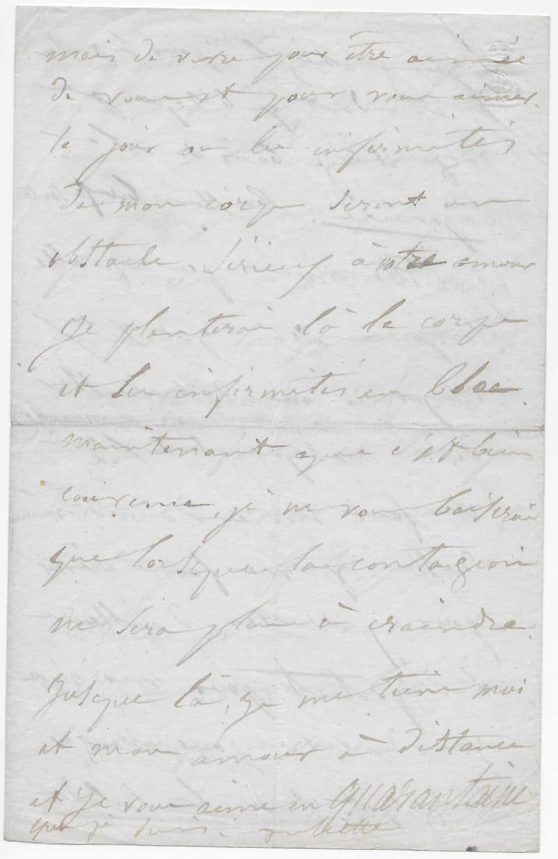 Jolie lettre de l’éternelle amoureuse enrageant de sa convalescence qui la tient éloigné de son « toto ». Elle se morfond, lui reprochant de ne pas lui avoir laissé le manuscrit à recopier des Misérables : « Je t’espère, mon toto et surtout je te désire de toute mon âme. Je suis bien punie de ne pouvoir pas t’accompagner mais cela m’est tout à fait impossible, pourvu que le brave père Triger ne prolonge pas indéfiniment ma réclusion ? Je suis à bout de patience et de résignation, aussi je suis capable malgré sa dépense, de me couper et de me hacher moi-même mon pied pour en finir encore plus vite. Si tu m’avais donné à copier [le manuscrit des Misérables] pendant ma réclusion forcée cela m’aurait fait trouver le temps moins long, mais tu ne me donnes rien à faire et les occupations de mon ménage ne sont pas faites pour distraire mon cœur de ton absence, au contraire si mr Triger n’est pas venu aujourd’hui j’enverrai ce soir Suzanne chez lui pour le presser, en attendant je bisque, je rage et je bois de la Saponaire boisson bienfaisante peut être, mais peu agréable. Toujours est-il que je veux essayer de me débarrasser de ce masque hideux qui me fait horreur, à moi-même. Dussai-je me faire crever pour y arriver. D’ailleurs l’important pour moi n’est pas de vivre pour manger du gigot et de la salade, mais de vivre pour être aimée. Le jour ou les infirmités de mon corps seront un obstacle sérieux à notre amour je planterai la le corps et les infirmités en bloc. Maintenant que c’est bien convenu, je ne vous baiserai que lorsque la contagion ne sera plus à craindre. Jusque là, je me tiens moi et mon amour à distance et je vous aime en quarantaine que je suis… »
