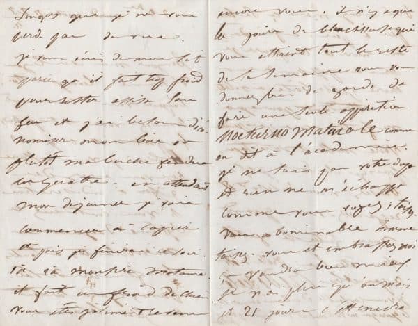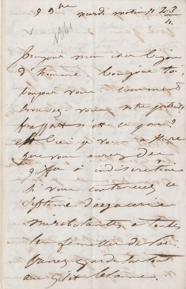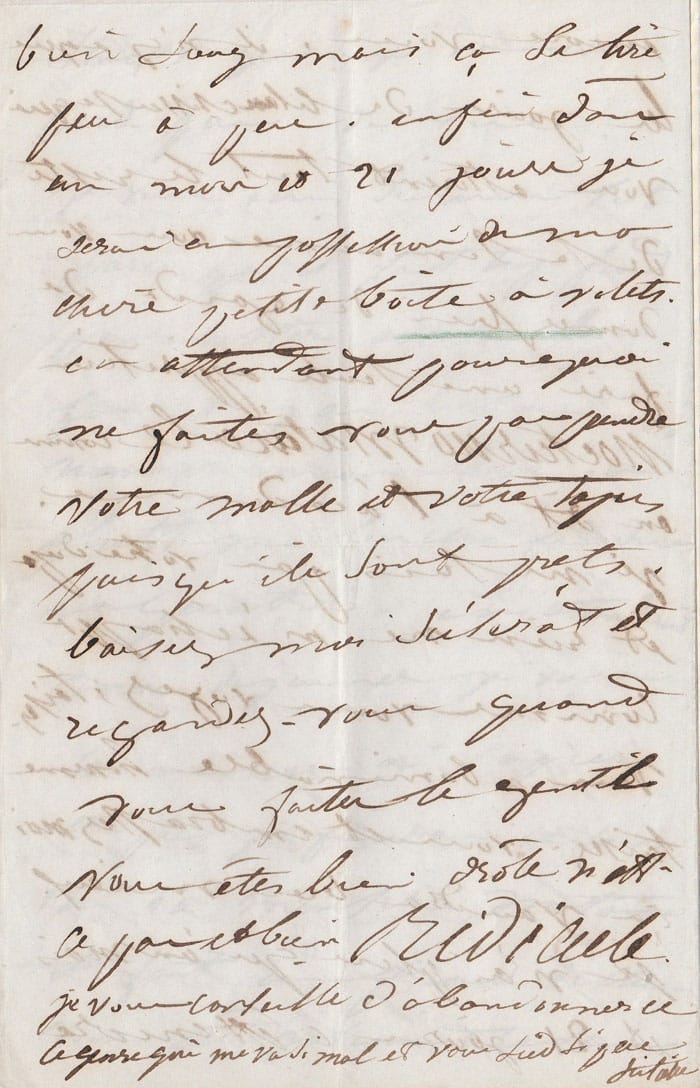 Superbe lettre pleine d’amour débordant et de vive jalousie : « Bonjour mon cher bijou d’homme. Bonjour toi, bonjour vous. Comment trouvez-vous votre portrait ? Frappant n’est-ce pas ? Et bien je vous assure que vous aurez des gifles à indiscrétion si vous continuez ce système d’agaceries mirobolantes à toutes les femelles de Paris. Prenez garde surtout au gilet blanc. Songez que je ne vous perde pas de vue. Je vous écris de mon lit parce qu’il fait trop froid pour rester assise sans feu et j’ai besoin d’économiser mon bois ou plutôt ma buche fendue en quatre. En attendant mon déjeuner je vais commencer à copier et puis finirai ce soir.. (…) il fait un froid de chien. Vous êtes joliment revenu encore vous. Il n’y a que les jours de blanchisseuse qui vous attirent tout le reste de la semaine vous vous donnez bien de garder de faire une seule apparition nocturno matinale comme on dit à l’académie [allusion à l’élection de Victor Hugo le 3 juin à l’Académie Française]. Je ne suis pas votre dupe et rien ne m’échappe comme vous voyez ; taisez-vous abominable homme taisez-vous et embrassez moi ça vaudra bien mieux. Je n’ai plus qu’un mois et vingt jours c’est encore bien long mais ça se tire peu à peu. Enfin dans un mois et 21 jours je serai en possession de ma chère petite boite à volets. En attendant pourquoi ne faites vous pas prendre votre malle et votre tapis puisqu’ils sont prêts. Baisez moi scélérat et regardez-vous quand vous faites le gentil vous êtes bien drôle n’est-ce pas et bien ridicule. Je vous conseille d’abandonner ce genre qui me va si mal et vous sied si peu. Juliette »