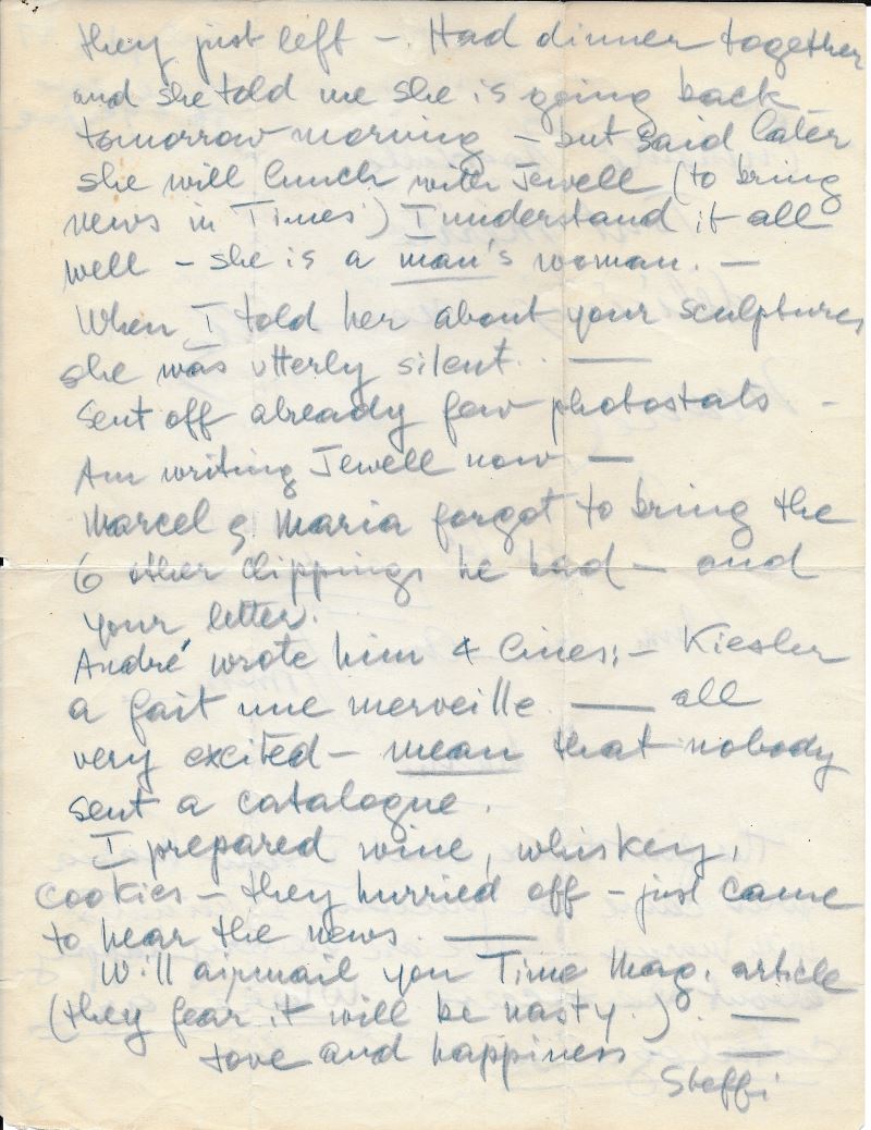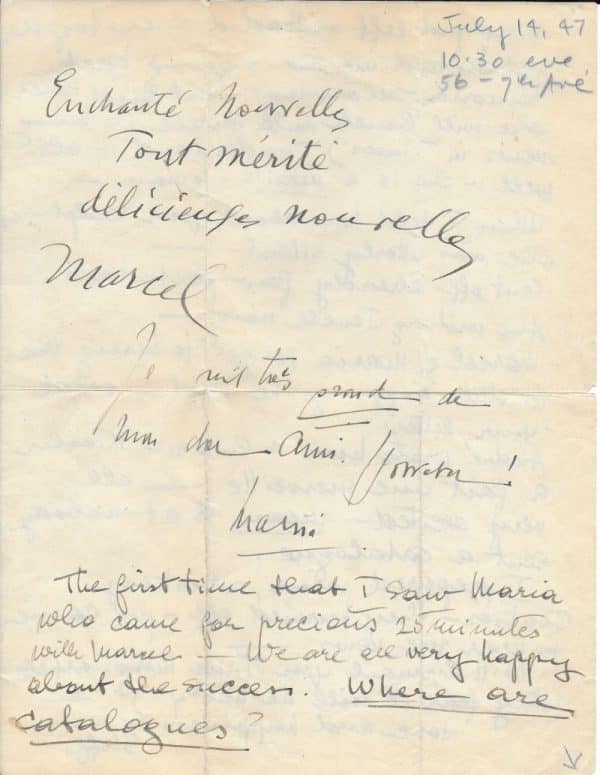 Marcel Duchamp félicite Frederick Kiesler pour sa prochaine exposition à la galerie Maeght, salle des superstitions conçue par Kiesler, dans le cadre de l’exposition internationale du Surréalisme présentée par André Breton et Marcel Duchamp : « Enchanté Nouvelles Tout mérité délicieuses nouvelles ». Lettre suivie de mots de félicitation de son amie la sculptrice brésilienne Maria Martins : « Je suis très proud de mon cher ami » ; et de sa femme Steffi Kiesler qui s’inquiète de ne pas recevoir de catalogues de l’exposition et transmet les félicitations d’André Breton et Marcel Duchamp : « The first time that i saw Maria who came for precious 25 minuts with Marcel. We are all very happy about the success. Where are catalogues ? They just left. Had dinner together and she told me she is going back tomorrow morning. But said later she will lunch with Jewell (to bring news in times). I understand it all well. She is a man’s woman. When i told her about your sculptures she was utterly silent. Sent off already few photostats. Am writing Jewell now. Marcel & Maria forgot to bring the 6 other clippings he had. And your letter. André [Breton] wrote him & Cinesi. Kiesler a fait une merveille. All very excited. Mean that nobody sent a catalogue. I prepared wine, whisky, cookies. They hurried off. Just came to hear the news. Will airmail you Time Mag. Article (they fear it will be nasty)… »
