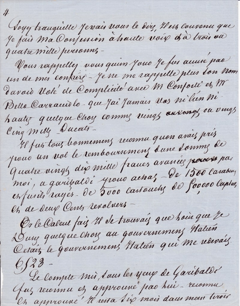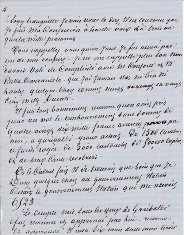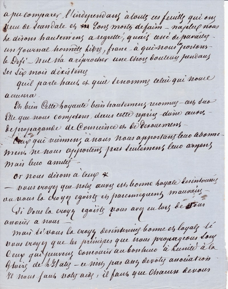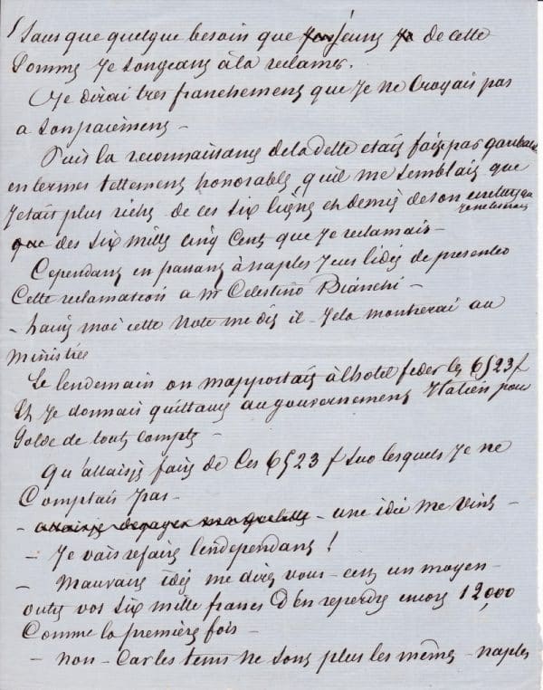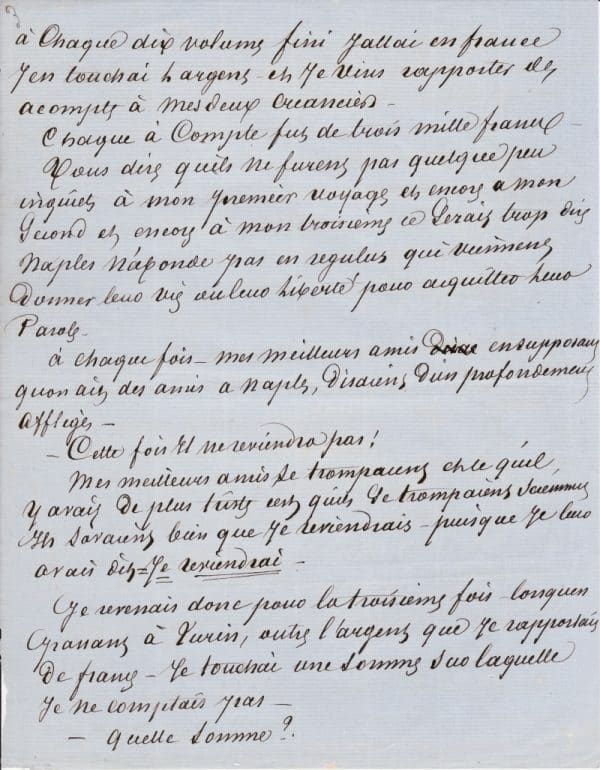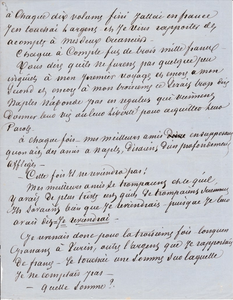 Manuscrit de travail raturé, biffé avec surcharges et ajouts destiné à être publié dans un des deux journaux que dirige Dumas l’Indepediente ou le Monte-Cristo à l’époque de sa présence à Naples entre 1861 et 1864.