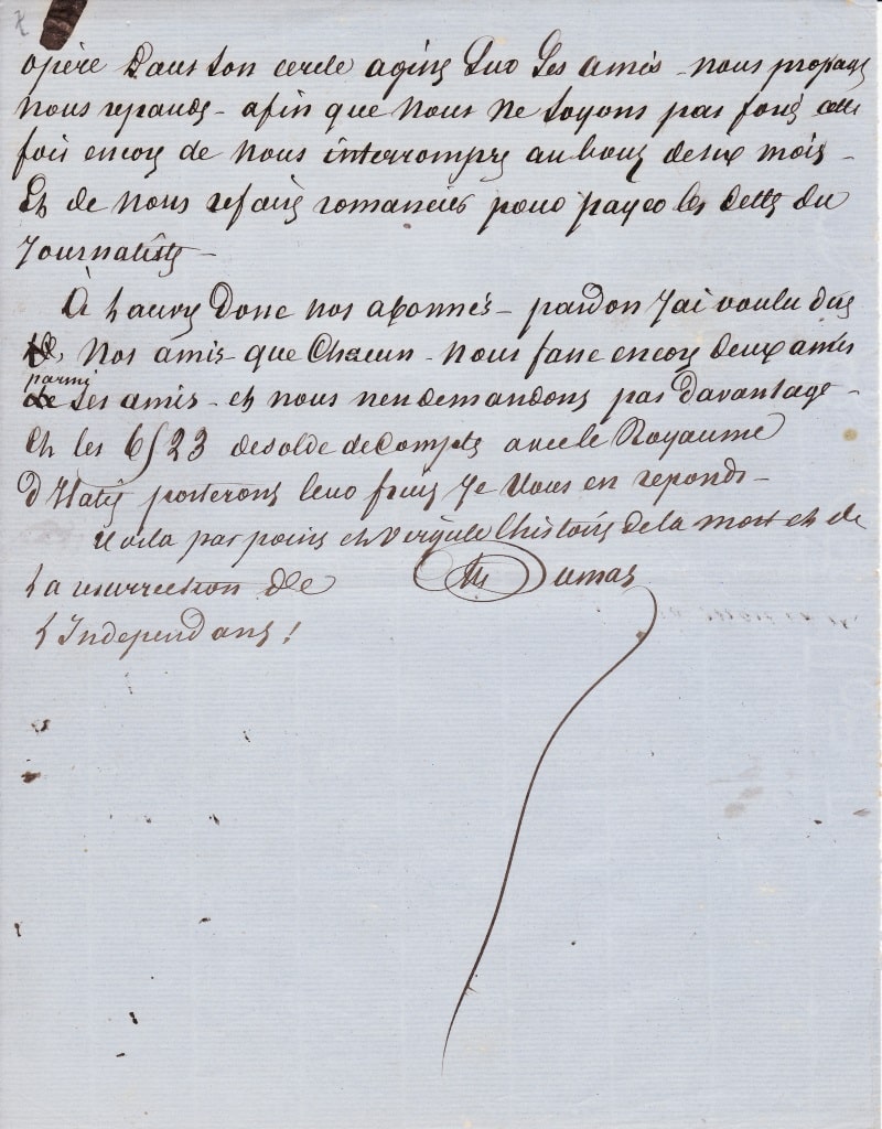 « Un de nos amis nous demande pourquoi en tête de notre journal nous n’avions pas mis notre profession de foi politique. Nous lui avons répondu que nous, n’avions pas cru qu’une profession de foi politique fut nécessaire en tête du journal de l’homme qui est à la fois l’ami de Victor Hugo et de Garibaldi qui a été fait pendant la dictature plusieurs fois citoyens de la Sicile et qui depuis deux ans perd son tems à dépenser son argent pour la cause de l’Italie – Vous eussiez du alors à insister le même ami faire une profession de foi morale. – Nous pensions avoir fait cette profession de foi avons-nous répondu le jour où nous avions écris les lignes suivantes ». Dumas rappelle, sans la reproduire, la profession de foi publiée dans la première série de l’Independant et si cela ne suffit pas, on peut regarder aisément dans la maison de verre qu’il s’est bâtie, dans son cœur, dans son esprit et même dans sa bourse. Pourquoi Dumas a-t-il suspendu pendant un an l’Independant ? Parce qu’il devait 18000 francs. Il se mit au travail et écrivit une trentaine de volumes pour la France dont les droits d’auteur couvrirent les dettes. Outre l’argent qu’il rapporta de France il toucha une somme sur laquelle il ne comptait pas, la somme de 90 000 francs avancée à Garibaldi pour des achats d’armes. Le gouvernement italien lui régla la dette de Garibaldi avec un reliquat de 6523 francs. Cet argent lui permit de relancer l’Independant, « un journal honnête, libre, franc à comparer des feuilles à scandale de Naples ». Les abonnés apportèrent de nouveaux abonnés. Dumas conclut son article : « Mais si vous la croyez désintéressée bonne et loyale si vous croyez que les principes que nous propageons sont ceux qui peuvent concourir au bonheur à l’unité à la gloire de l’Italie – ce n’est pas assez de votre association Il nous faut votre aide, il faut que chacun de vous opère dans son cercle (…) afin que nous ne soyons pas pour cette fois encore de nous interrompre au bout de six mois. (…) Voilà par point et virgule l’histoire de la mort et de la résurrection de l’Independant ! »