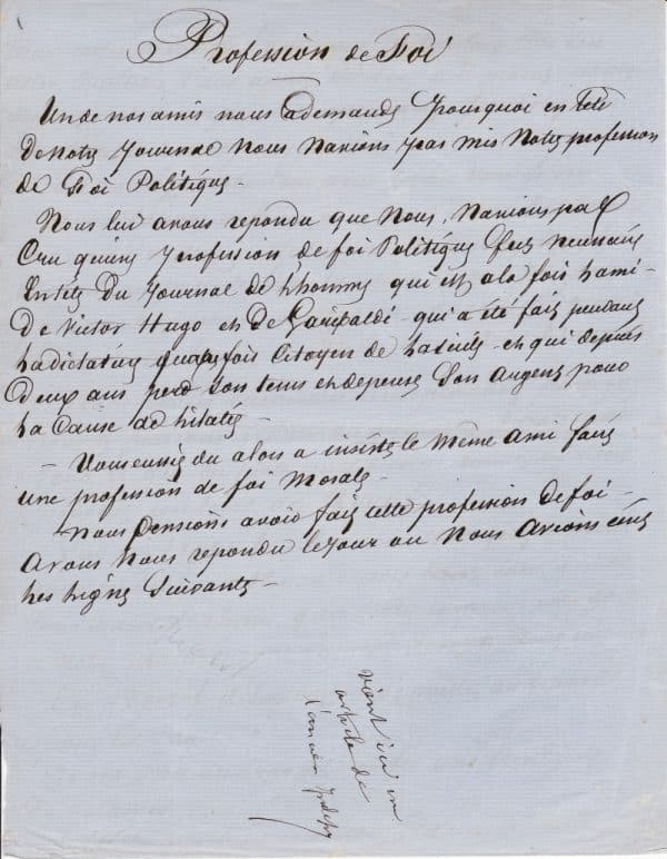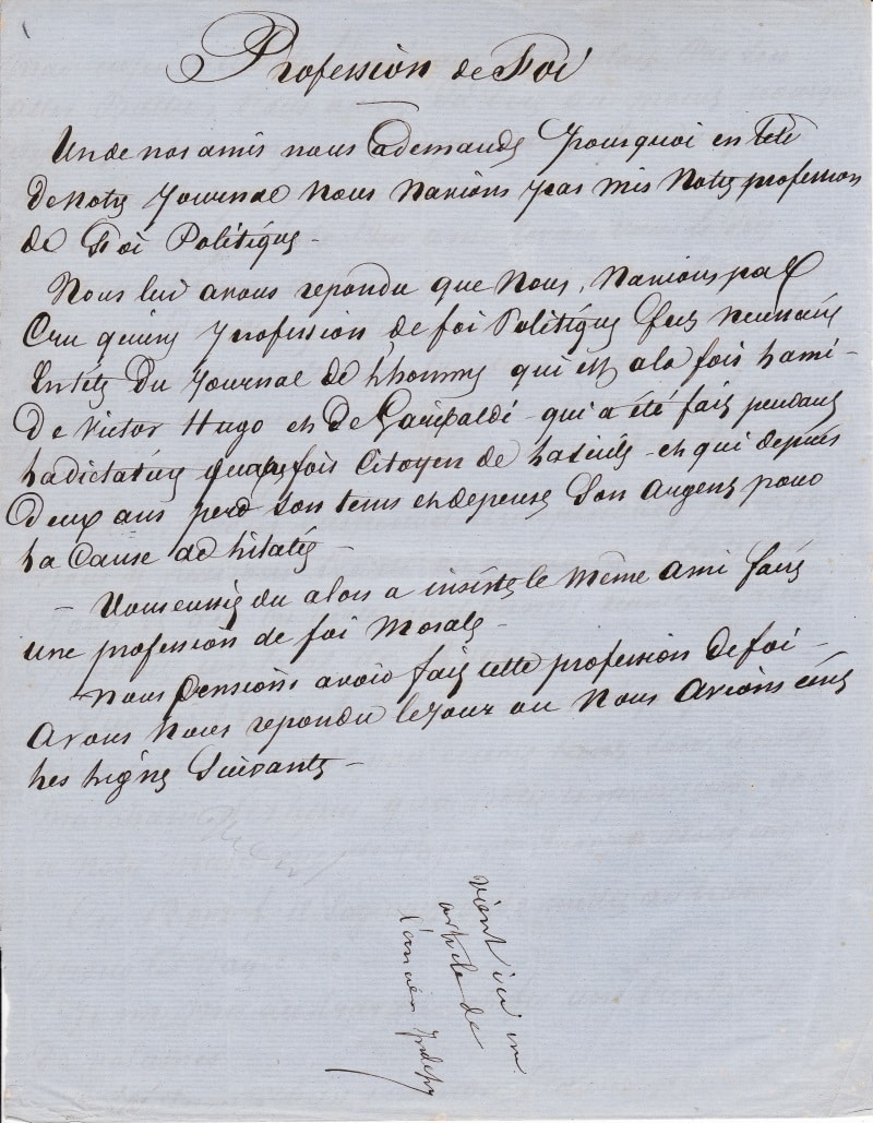 Manuscrit autographe signé intitulé « Profession de foi ». (1861-1864) ; 7 pages in-4° sur feuillets simples