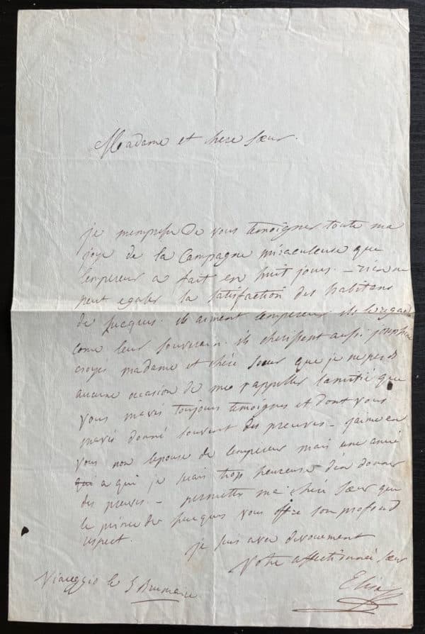 Beau témoignage d’amitié envers l’impératrice faisant suite à la nomination d’Elisa Bonaparte au titre de princesse de la principauté de Lucques et Piombino : « Madame et chère sœur, Je m’empresse de vous témoigner toute ma joye de la campagne miraculeuse que l’empereur a fait en huit jours. Rien ne peut égaler la satisfaction des habitants de Lucques. Ils aiment l’empereur ils le regardent comme leur souverain. Ils chérissent aussi Joséphine. Croyez madame et chère sœur que je ne perds aucune occasion de me rappeller l’amitié que vous m’avez toujours témoigner et dont vous m’avez donné souvent preuves. J’aime en vous non l’épouse de l’empereur mais une amie à qui je suis trop heureuse d’en donner des preuves. Permettez ma chère sœur que le prince de Lucques [ Félix Baciocchi son époux] vous offre son profond respect. Je suis avec dévouement votre affectionnée sœur… »