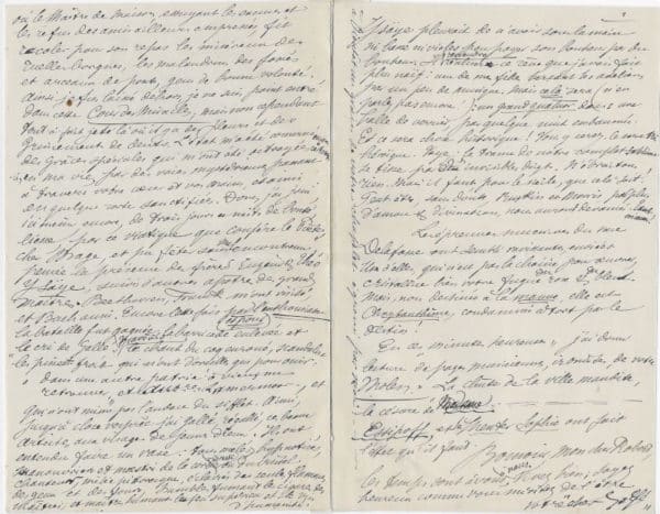 « Mon cher Robert, et bienfaiteur, Pardonnez à votre « cher Gallé » ! Des circonstances heureuses ne mon point laissé la réplique. Je n’ai pas voulu, de vive voix, à l’instant qui peut devenir celui des adieux, entreprendre le sujet de ma gratitude envers vous, parce que ma sensibilité le rend inexprimable ainsi. J’ai préféré laisser le dentiste et le rhume de cerveau épuiser ma cassette aux mouchoirs. « Les pleurs en disent plus ! ». J’ai très bien su me raidir contre mon émoi, mais sachez bien qu’aucun geste, aucun acte, aucun signe, voir secret, de votre angélique fraternité n’est resté inaperçu, mais profondément ressenti, savouré, présenté en offrande intérieure à qui nous redevons le pain quotidien et tout le miel surérogatoire… ; les attitudes de bénédiction de mon âme ont été son intime pose, et posées sur votre bonté, durant mon voyage et mon revenez-y bienheureux, au pays des purs cygnes, les blancs et les noirs, le féerique domaine, vôtre par droit de plumage et candeur et d’ébène aussi, par votre droit de conquête sans rival. Je suis donc rentré dans mon héritage, par deux fois en quinze jours, par vous gratifié, réédifié, édifié, surgi, instauré, et puis restauré de mille sortes, comblé comme une coupe pleine de fleurs et qui tremble de se rompre. J’ai emporté après mes ailes de corbeau, un peu de poussière d’arc en ciel des vôtres, et vos reflets me font encore une auréole. Ai-je un peu aussi, roussi mes pennes tristes dans tous ces feux de Bengale, intellectuels et joyeux, allumé autour et au loin en avant de moi par votre génie, quelque fois pour moi seul.. Je n’ai pas eu l’instant de me replier sous la pluie froide et réelle. Nous dînons et soupons tous ici de votre desserte ; père, époux, filles et gens sont joyeux quand maître Gallé met les épingles de ses cravates, et marche dan les nuages roses. Adieu la tragique histoire !.. Je veux, quelques heures encore me vêtir de cette atmosphère de beauté riante et de pimpante bonté, et, « décrassé », comme dit le Saint de Sales, – produire sous vos belles influences…quelque ouvrage dont vous serez le parrain. Sans doute ces feux de joie seront demain soufflés ; au moins je sais, à présent, que les misères sont la monnaie sombre des splendides achats, je ne croirai plus jamais (dussé-je attendre mes emplètes jusque par delà) payer trop cher ces moments profonds que nous ouvre le Dieu…Et cependant, Chantilly m’a fait manquer Persifal proparte, ame chœurs, monte ici un peu pour moi j’ose dire ; et les perpétuels rajeunissement du réveillon florentin chez Hugo, le bon maître et ses doux enfants, ne m’a pas permis comme j’avais, non l’impiété, mais la confiance en mes forces d’y compter, être le convive invité, attendre, à ce bien autre festin de noël où le maître de maison, essuyant les excuses et les refus des amis ailleurs empressés, fit racoler pour son repas les miséreux des ruelles borgnes, les malandrins des fossés et arceaux de ponts, gens de bonne volonté. Ainsi je fus laissé dehors, je ne suis point entré dans cette cour des miracles ; mais non cependant tout à fait jeté là où il y a des fleurs et des grincements de dents. L’état m’a été concerné encore des grâces spéciales qui m’ont été octroyées ces temps-ci, en ma vie, par des voies mystérieuses passant à travers votre cœur et vos mains, et ainsi en quelque sorte sanctifiées. Donc j’ai joui ici même, encore, de trois jours et nuits de bonté, liesse, par ce viatique que confère le poète, cher mage, et pu fêter sans malencontreuse pensée la présence des frères Eugène & Théo Ysaÿe, suivis d’autres apôtres des grands maîtres. Beethoven, Franck m’ont visité, et Bach aussi. Encore cette fois par et pour l’enthousiasme la bataille fut gagnée, la barricade enlevée et le cri de Gallé Bravo. Le chant du coq enroué, scandalisa les pisses-froid qui n’ont d’oreilles que pour ouïr : « dans une autre patrie ! o vieux me retrouver, et amorer lamermor » qui n’ont même pas l’audace du sifflet. Ainsi, jusqu’à close vesprée j’ai gallé, régallé, ces beaux artistes aux visages de jeunes dieux. Ils ont entendu faire un vase : tons mêlés, hypnotisés, manouvriers et maestri de la corde vibrante et du cristal chanteur, mêlée pittoresque, éclairés des seuls flammes des yeux et des fours, humbles fumant les cigares des maîtres, et maîtres humant le feu supérieur et le vin d’humanité. Ysaÿe pleurait de n’avoir sous la main ni basse ni viole pour payer son bonheur par du bonheur. Il reviendra réaliser ce rêve que j’avais fait plus naïf : une de mes filles berçant les ateliers par un peu de musique. Mais cela sera (n’en parlez pas encore !) : un grand quatuor dans une halle de verrier, par quelque nuit embaumée. Et ce sera chose historique ! Vous y serez. Ce sera très héroïque. Voyez : la trame de notre complet sublime se tisse par d’invisibles doigts. N’ébruitons rien. Mais il faut pour le siècle, que cela soit. Peut-être, sans doute, Ruskin et Morris, pour plus d’amour & divination, nous aurons devancés. Les épreuves successives du vase Delafosse ont semblé ravissantes, enviées. Une d’elles, qui n’est pas la choisie pour œuvrer cristallise bien votre fugue en rose & en bleu. Mais, non destinée à la mauve, elle est chrysanthème, condamnée à mort par le destin ! En ces minutes heureuses, j’ai donné lecture de pages musiciennes, de vases Molen. La chute de la ville maudite, la césure de Madame…Essipoff et la Mente Sophie ont fait l’effet qu’il faut. Bonsoir mon cher Robert, les temps sont à vous, à nous. Vivez bien ; soyez heureux comme vous méritez de l’être. Votre cher Gallé. » En marge : « à bientôt un grain de votre chapelet égrené par moi… »