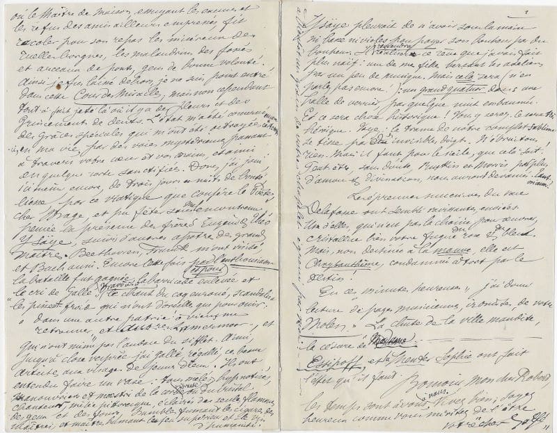 Superbe lettre poétique de reconnaissance émue à son ami et bienfaiteur, auteur de l’article « Cette petite clef-ci », évocation de la visite d l’atelier de Gallé sous forme de reprise du conte de Barbe-Bleue, publié dans La Plume du 1er novembre 1895. Il déclame son émotion à vif, évoque pêlemêle un réveillon chez les Hugo, Beethoven, Franck, Bach joués par les frères Ysÿe qu’il rêve de faire revenir en quatuor dans une halle de verrier par des nuits embaumées :