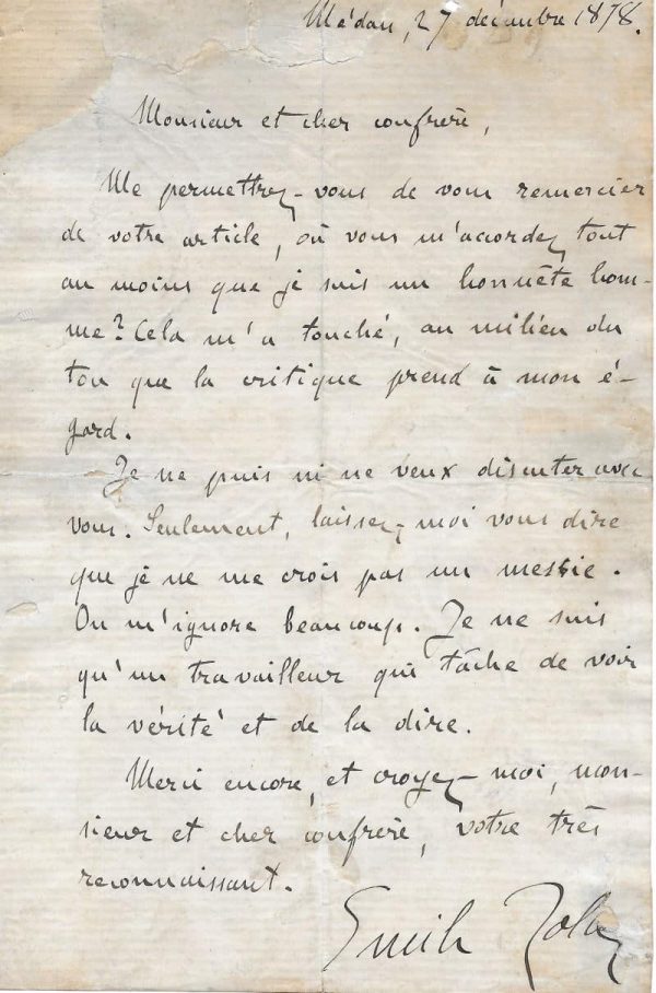 Lettre autographe signée à un confrère. Médan, 27 décembre 1878 ; 1 pages in-8°. Réparations au dos avec quelques imperfections