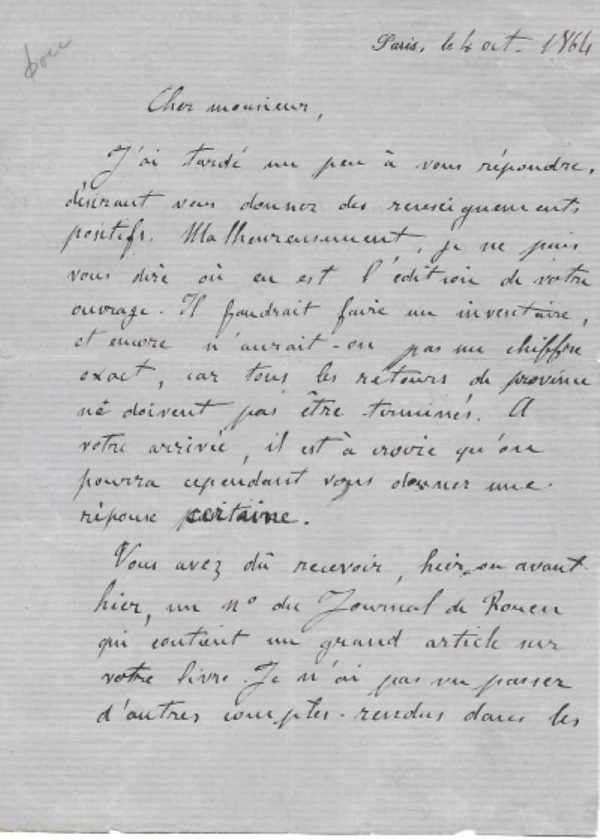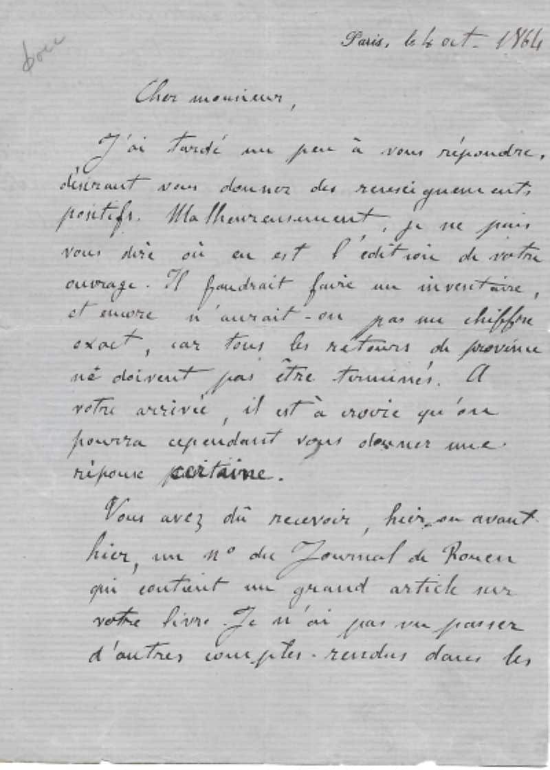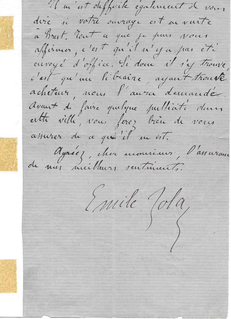 Le jeune Zola, alors chef de service de la publicité chez Hachette, rend compte des recherches infructueuses concernant l’édition d’un livre : « J’ai tardé un peu à vous répondre désirant vous donner des renseignements positifs. Malheureusement, je ne puis vous dire où en est l’édition de votre ouvrage. Il faudrait faire un inventaire, et encore n’aurait-on pas un chiffre exact, car tous les retours de province ne doivent pas être terminés. A votre arrivée, il est à croire qu’on pourra cependant vous donner une réponse certaine. Vous avez dû recevoir, hier, ou avant-hier, un n° du Journal de Rouen qui contient un grand article sur votre livre. Je n’ai pas vu passer d’autres comptes-rendus dans les. Il m’est difficile également de vous dire si votre ouvrage est en vente à Brest. Tout ce que je puis vous affirmer, c’est qu’il n’y a pas été envoyé d’office. Si donc il s’y trouve c’est qu’un libraire ayant trouvé acheteur, nous l’aura demandé avant de faire quelque publicité dans cette ville, vous ferez bien de vous assurer de ce qu’il en est… »