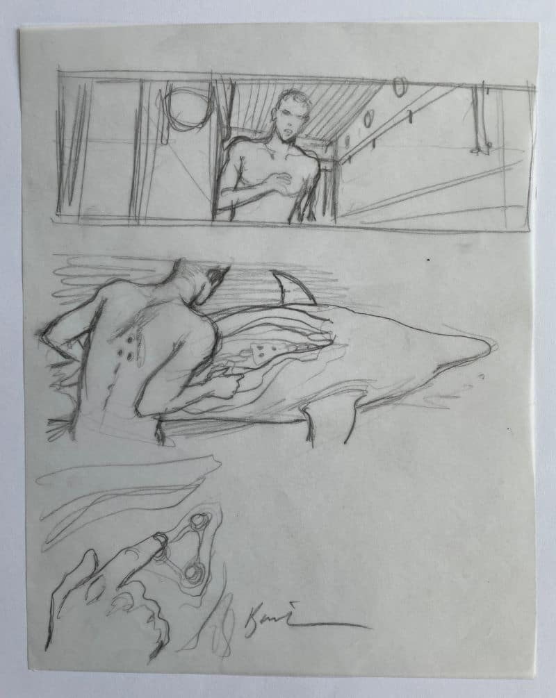 Dessin original mine de plomb sur calque, 16,6 x 21 cm, signé. Crayonné préparatoire mettant en scène un homme et un dauphin.