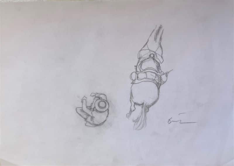 Dessin original mine de plomb sur calque, 29,7 x 21 cm, signé. Crayonné préparatoire mettant en scène un homme assis en tailleur et son cheval.
