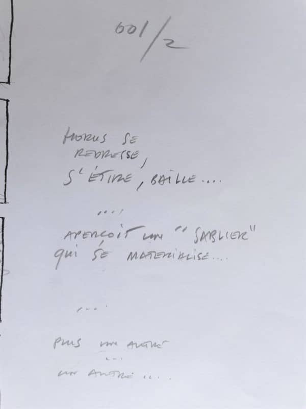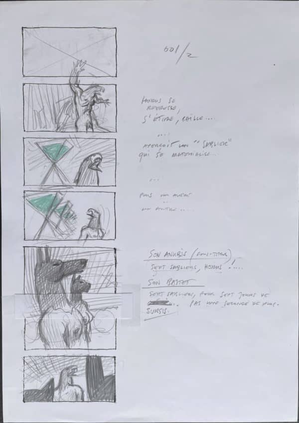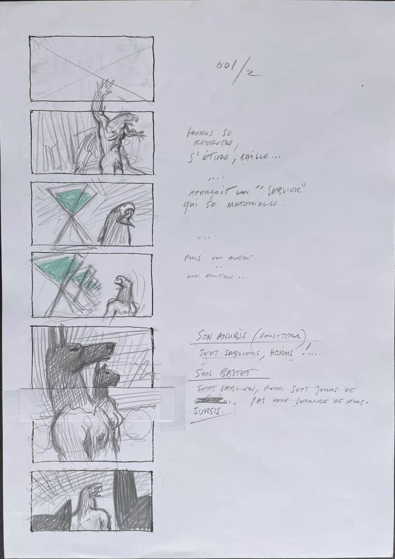 Planche originale numérotée 001/2. Mine de plomb et crayon de couleur vert sur papier épais, 42 x 29,7 cm. Tampon au dos de la société « Duran animation studio ». Annotations narratives de l’auteur : « Horus se redresse, s’étire, baille… », « Aperçoit un “ sablier ” qui se matérialise… », « Puis un autre…un autre », « Son Anubis (sous-titre) Sept sabliers, Horus !… Son Basset Sept sabliers, pour sept jours de sursis. Pas une seconde de plus. »