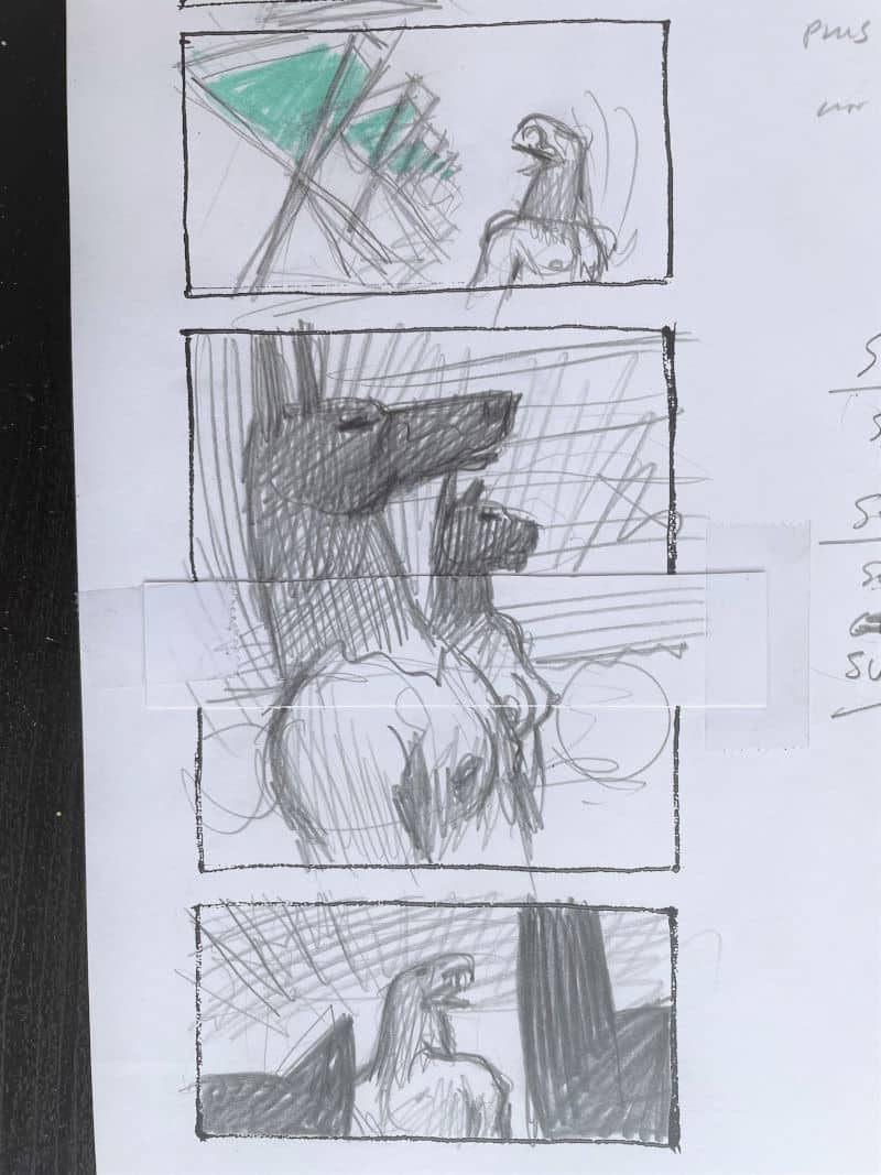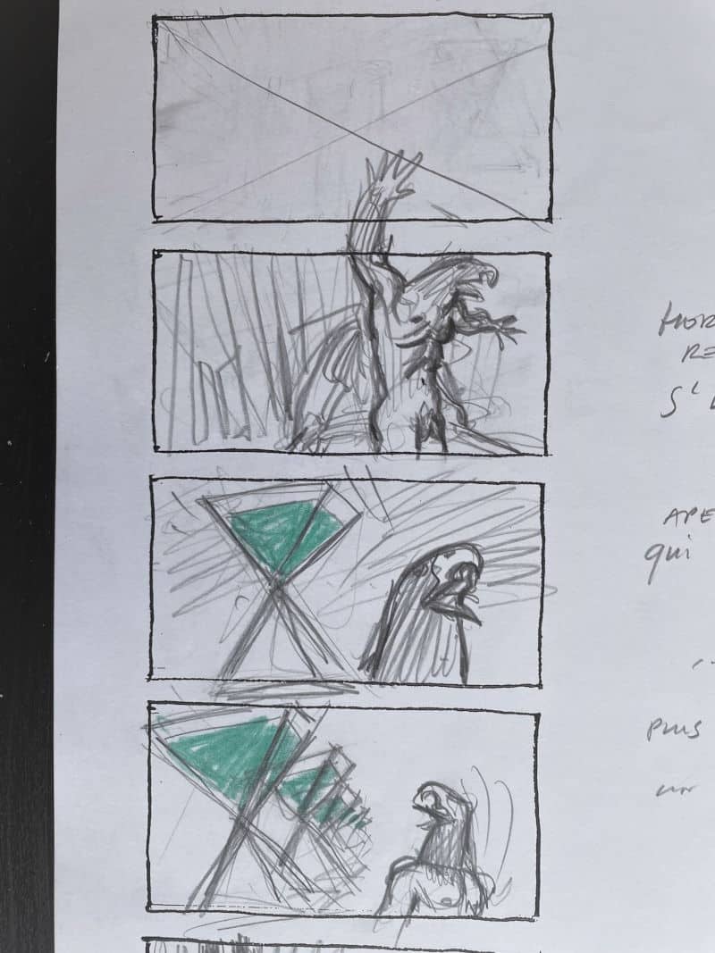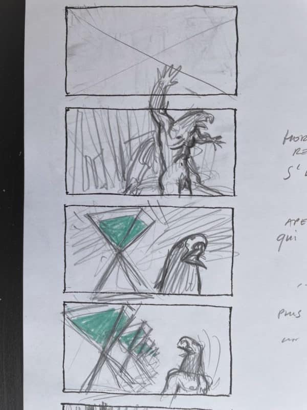 Storyboard original réalisé par Enki Bilal pour le film « Immortel (ad vitam) » sorti en 2004, écrit en collaboration avec Serge Lehman, reprenant librement les deux albums phares de l’auteur « La Foire aux immortels » et « La Femme piège »