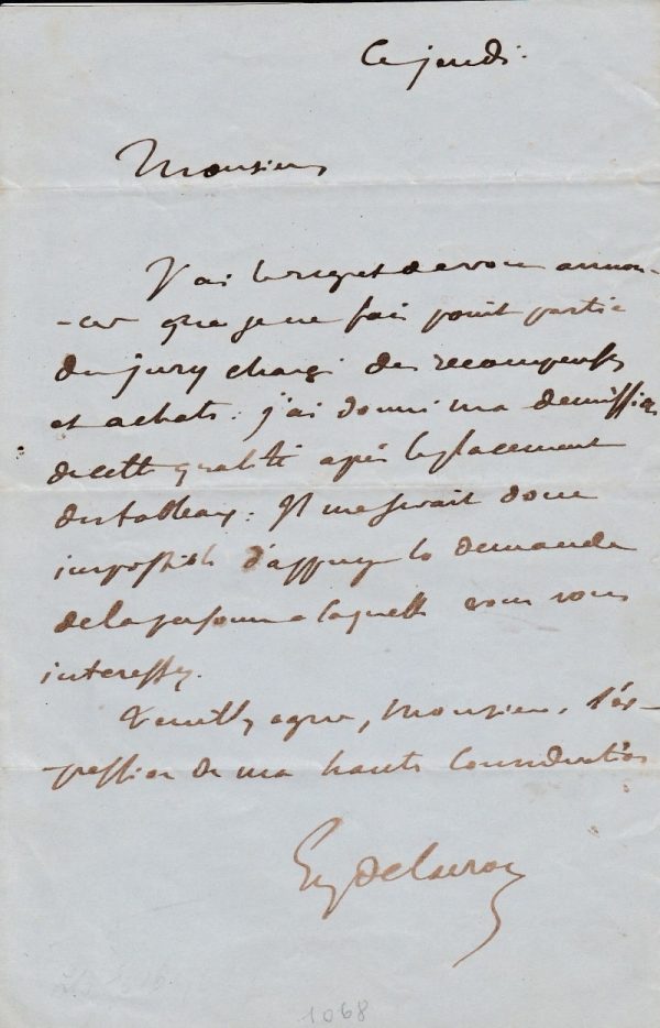 Le peintre annonce qu’il ne fait plus parti du jury d’exposition : « Monsieur, J’ai le regret de vous annoncer que je ne fais point partie du jury chargé des récompenses et achats. J’ai donné ma démission de cette qualité après le placement des tableaux. Il me serait donc impossible d’appuyer la demande de la personne à laquelle vous vous intéressez… »