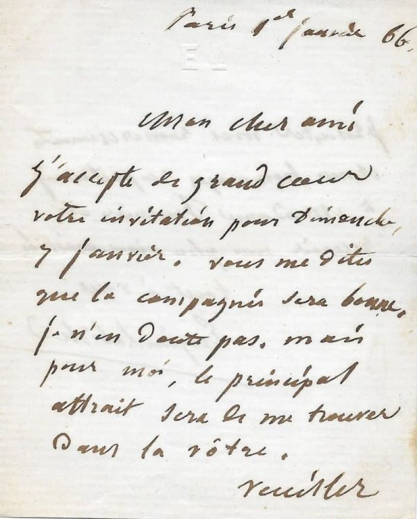 Lettre autographe signée à Monsieur Fournier. Paris 1er janvier 1866 ; 2 pages in-12°.