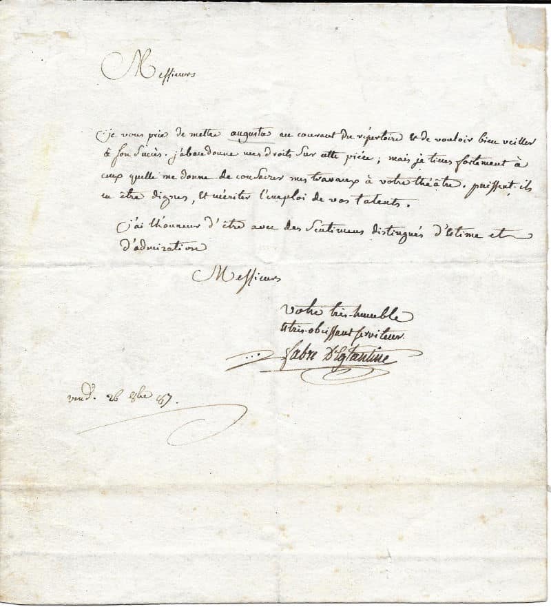 Belle et fort rare lettre de Fabre d’Eglantine au sujet de sa tragédie en cinq actes Augusta jouée pour la première fois à Lyon en septembre 1783, le premier rôle étant interprété par Collot d’Herbois. Une fois installé à Paris en 1787, Fabre d’Eglantine se consacre uniquement à la comédie, il crée Augusta à la Comédie Française le 8 octobre 1787, mais elle ne séduit pas et est interrompue au bout de six représentations : « Je vous prie de mettre Augusta au courant du répertoire et de vouloir bien veiller de son succès. J’abandonne mes droits sur cette pièce ; mais je tiens fortement à cœur qu’elle me donne de consacrer mes travaux à votre théâtre. Puissent-ils en être digne, et mériter l’emploi de vos talents. J’ai l’honneur d’être avec des sentiments distinguées d’estime et d’admirations… »