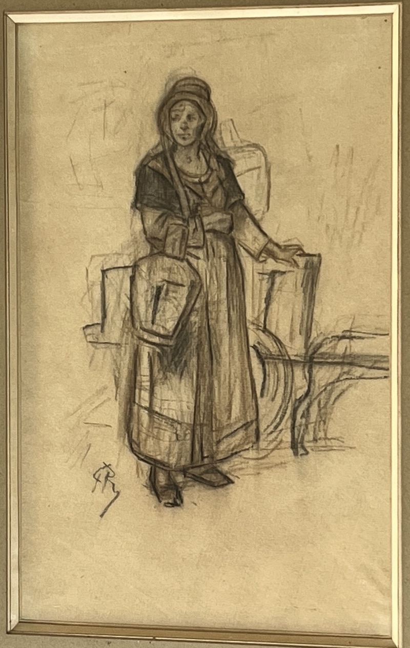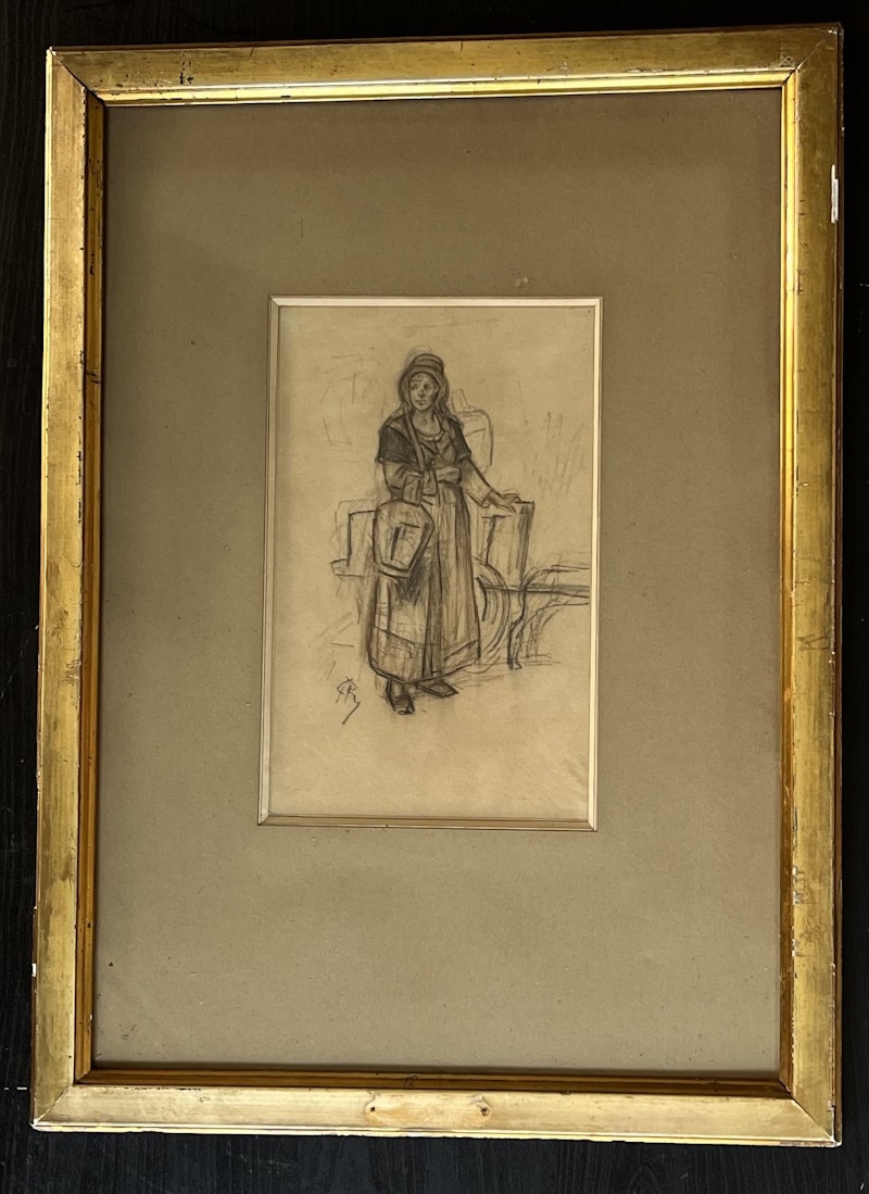 Beau dessin d’une jeune laitière, portant une cruche au bras, la main appuyée sur une charrette attelée par un chien.