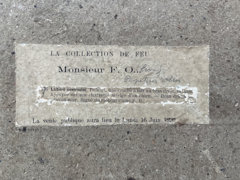 Provenance : Collection de Monsieur F. Olin (vente publique du 16 juin 1890 chez A. Bluff, libraire 10 rue du Gentilhomme à Bruxelles, première vente aux enchères des œuvres de Félicien Rops en Belgique lot n°476 au catalogue (coquille à l’impression du catalogue et mention erronée sur l’étiquette figurant le lot n°456 s’agissant d’une lithographie figurant Alfred de Musset). Galerie de Vuyst, Lokeren, vente publique du 17 mai 2025 lot 54. Galerie Thinus, Schilde Belgique.