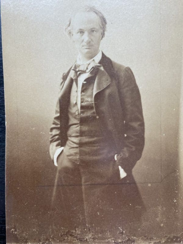 Exceptionnelle et très rare photographie originale représentant Charles Baudelaire, les mains dans les poches, lèvres serrées, regardant fixement le photographe de son regard pénétrant. Le poète maudit, prince des dandys, porte orgueilleusement sa célèbre redingote noire par-dessus un gilet, surmonté d’une cravate jabot rouge sang. Cette année-là, Baudelaire est candidat malheureux au fauteuil d’Eugène Scribe à l’Académie Française. C’est un homme meurtri, comme le laisse voir ce visage tragique, dont l’œuvre de sa vie, Les Fleurs du Mal, a dû être amputée de six poèmes jugés contraires aux bonnes mœurs.