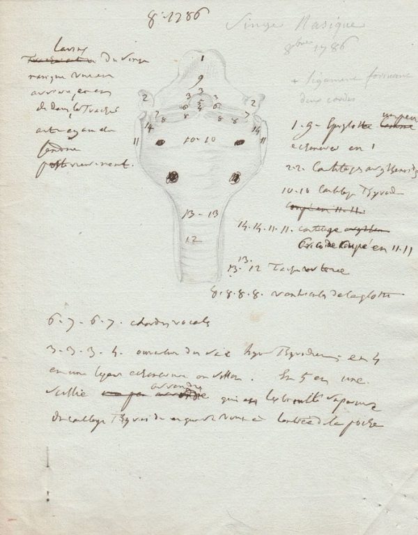 Superbe et fort rare manuscrit du célèbre médecin traitant de la dissection d’un singe nasique avec de nombreux commentaires anatomiques accompagné d’un beau croquis au crayon du larynx et de la trachée artère.