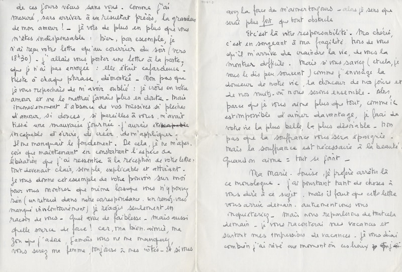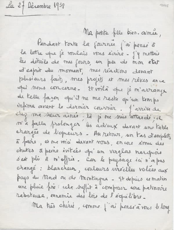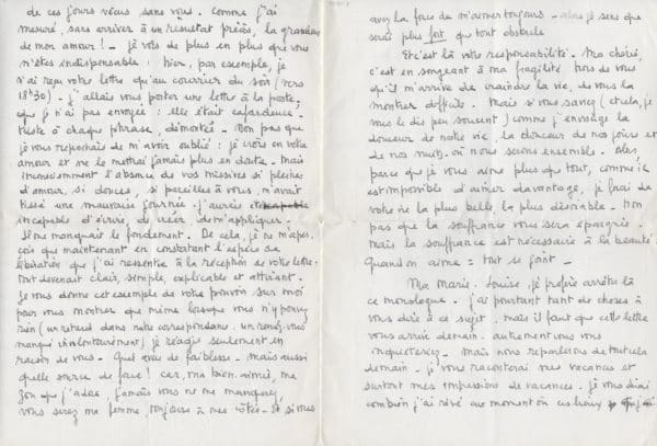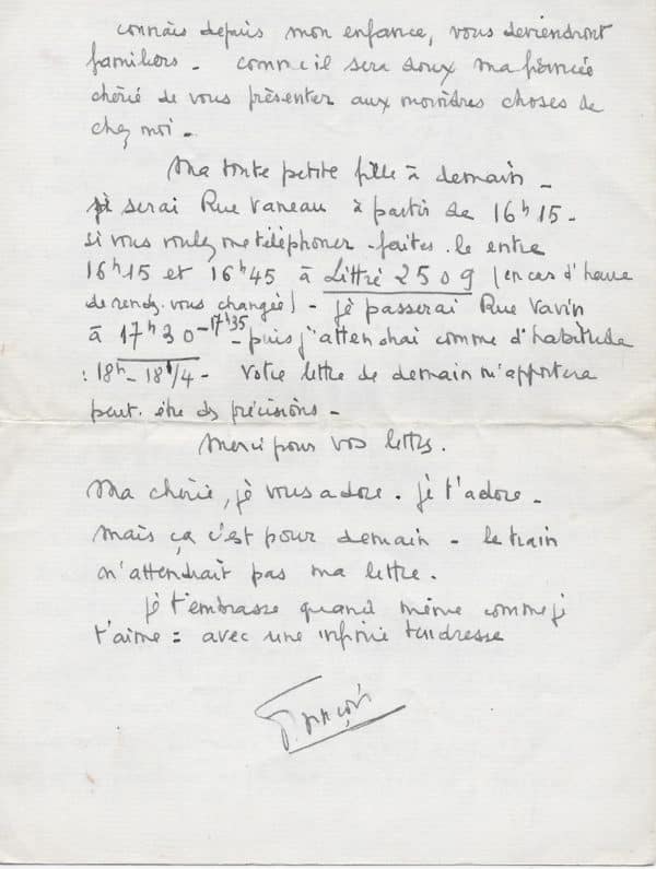 Superbe lettre du jeune Mitterrand, transi d’amour, qui philosophe avec délectation, sur sa passion amoureuse : « Ma petite fille bien aimée, Pendant toute la journée j’ai pensé à la lettre que je voulais vous écrire. J’y mettais les détails de mes jours, un peu de mon état d’esprit du moment, mes réactions devant plusieurs faits, mes projets et mes rêves en ce qui me concerne. Et voilà que je m’arrange de telle façon qu’il ne me reste qu’un temps infime avant le dernier courrier. J’arrive de chez ma sœur ainée ; là je me suis attardé ; il m’a fallu prolonger les adieux devant une table chargée de liqueurs. Au retour, un tas d’emplettes à faire, et me voici devant vous, encore ému des chutes à peine évitées qu’un verglas narquois s’est plu à m’offrir. Car le paysage ici n’a pas changé : blancheur, couleurs irréelles volées au pays du nord ou de montagne. Et depuis ce matin une pluie fine : cela suffit à composer une patinoire raboteuse, ennemie des lois de l’équilibre. Ma très chérie, comme j’ai pensé à vous le long de ces jours vécus sans vous. Comme j’ai mesuré, sans arriver à un résultat précis, la grandeur de mon amour ! Je vois de plus en plus que vous m’êtes indispensable : hier, par exemple, je n’ai reçu votre lettre qu’au courrier du soir (vers 18h30). J’allais vous porter une lettre à la poste, que je n’ai pas envoyée : elle était cafardeuse, triste à chaque phrase, démontée. Non pas que je vous reprochais de m’avoir oublié : je crois en votre amour et ne le mettrai jamais plus en doute. Mais inconsciemment l’absence de vos missives si pleines d’amour, si douces, si pareilles à vous, m’avait tissé une mauvaise journée. J’aurais été incapable d’écrire, de créer, de m’appliquer. Il me manquait le fondement. De cela, je ne m’aperçois que maintenant en constatant l’espèce de libération que j’ai ressentie à la réception de votre lettre : tout devenait clair, simple, explicable et attirant. Je vous donne cet exemple de votre pouvoir sur moi pour vous montrer que même lorsque vous n’y pouvez rien (un retard dans notre correspondance, un rendez-vous manqué involontairement) je réagis seulement en fonction de vous. Quel aveu de faiblesse. Mais aussi quelle source de force ! Car, ma bien-aimée, ma zou que j’adore, jamais vous ne me manquerez, vous serez ma femme, toujours à mes côtés. Et si vous avez la force de m’aimer toujours, alors je sens que [je] serai plus fort que tout obstacle. Et c’est la votre responsabilité. Ma chérie, c’est en songeant à ma fragilité hors de vous qu’il m’arrive de craindre la vie, de vous la montrer difficile. Mais si vous saviez (et cela, je vous le dis peu souvent) comme j’envisage la douceur de notre vie, la douceur de nos jours et de nos nuits, où nous serons ensemble. Alors, parce que je vous aime plus que tout, comme il est impossible d’aimer d’avantage, je ferai de votre vie la plus belle, la plus désirable, non pas que la souffrance vous sera épargnée, mais la souffrance est nécessaire à la beauté. Quand on aime = tout se joint. Ma Marie-Louise, je préfère arrêter là ce monologue. J’ai pourtant tant de chose à vous dire à ce sujet, mais il faut que cette lettre vous arrive demain, autrement vous vous inquiéteriez. Mais nous reparlerons de tout cela demain. Je vous raconterai mes vacances et surtout mes impressions de vacances. Je vous dirai combien j’ai rêvé au moment où ces lieux que je connais depuis mon enfance, vous deviendront familiers. Comme il sera doux ma fiancée chérie de vous présenter aux moindres choses de chez moi. Ma toute petite fille à demain. Je serai rue Vaneau à partir de 16h15. Si vous voulez me téléphoner faite-le entre 16h15 et 16h45 à Littré 2509 (en cas d’heure de rendez vous chargée). Je passerai rue Vavin à 17h30-17h35. Puis j’attendrai comme d’habitude 18h-18 ¼. Votre lettre de demain m’apportera peut-être des précisions. Merci pour vos lettres. Ma chérie, je vous adore. Je t’adore. Mais ça c’est pour demain. Le train n’attendrait pas ma lettre. Je t’embrasse quand même comme je t’aime : avec une infinie tendresse. François »