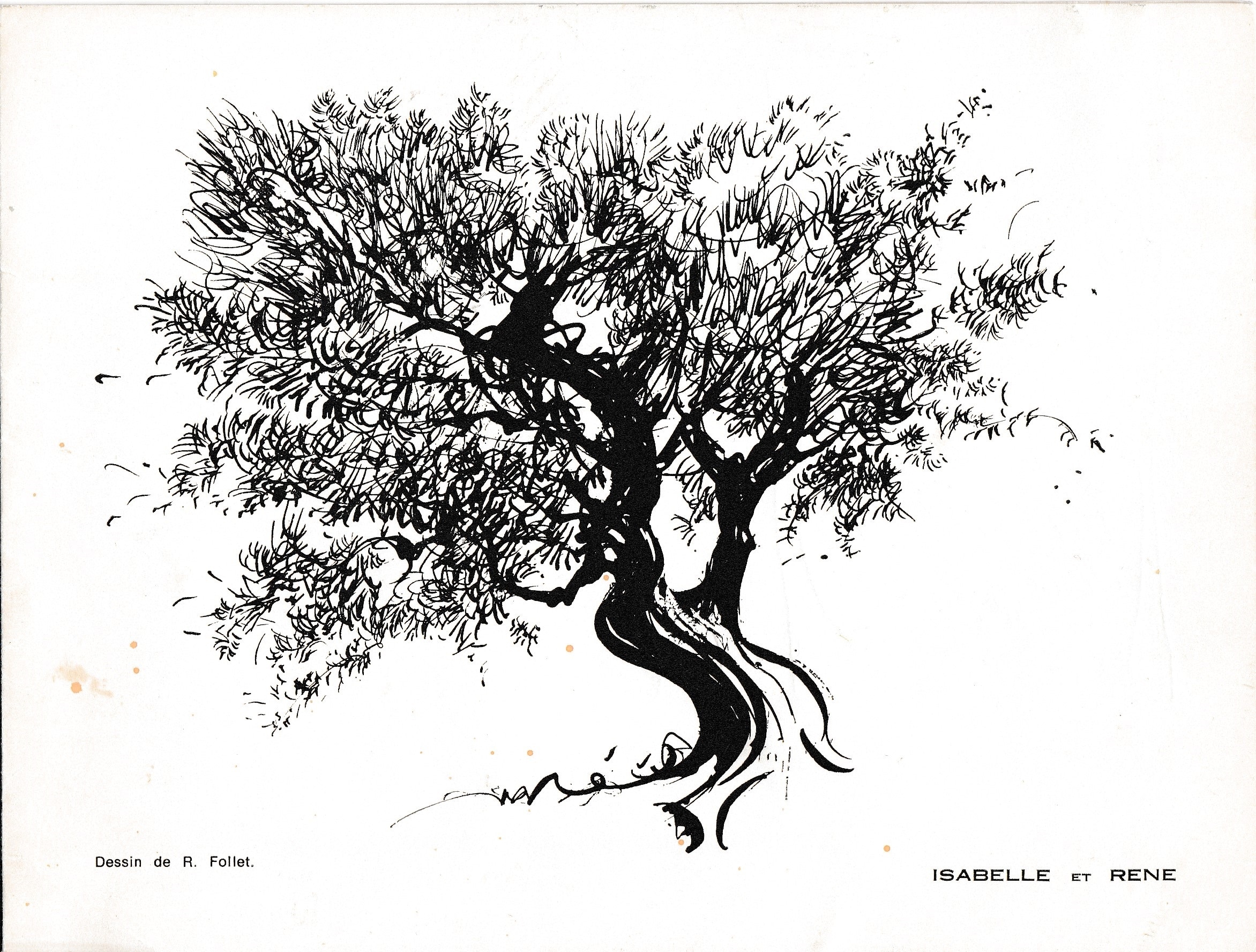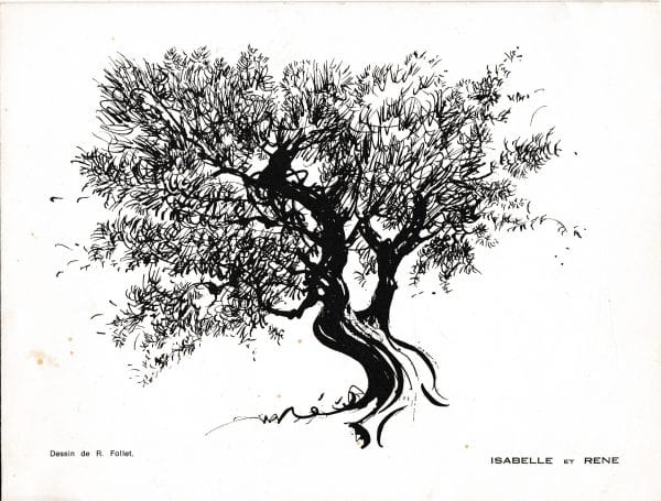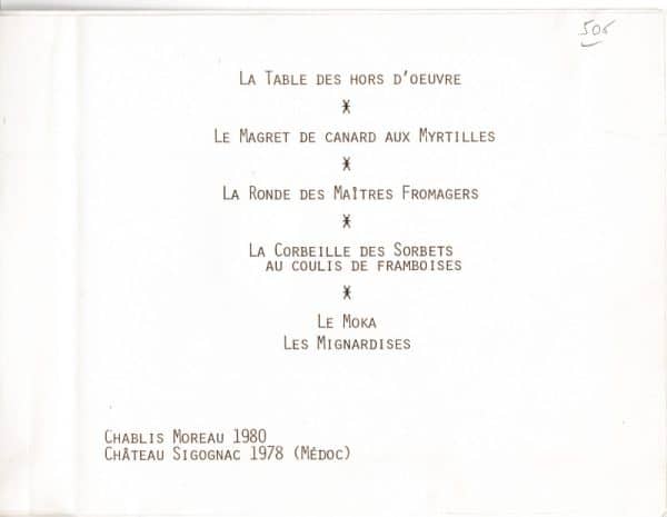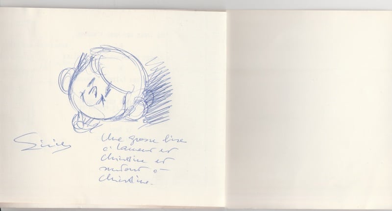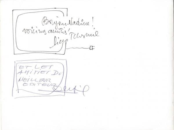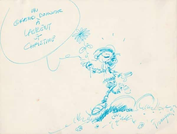 Carte de menu du mariage de la fille de l’artiste, Isabelle Franquin. Au dos, superbe illustration à l’encre bleue représentant Gaston Lagaffe sautant de joie une fleur à la main, dédicacée et signée. La face représente un arbre imprimé de René Follet. A l’intérieur, une dédicace de Pierre Tchernia, de l’éditeur Dupuis, et une illustration au stylo bille de Sirius représentant Bouldadar dédicacée et signée. 20 x 15 cm.