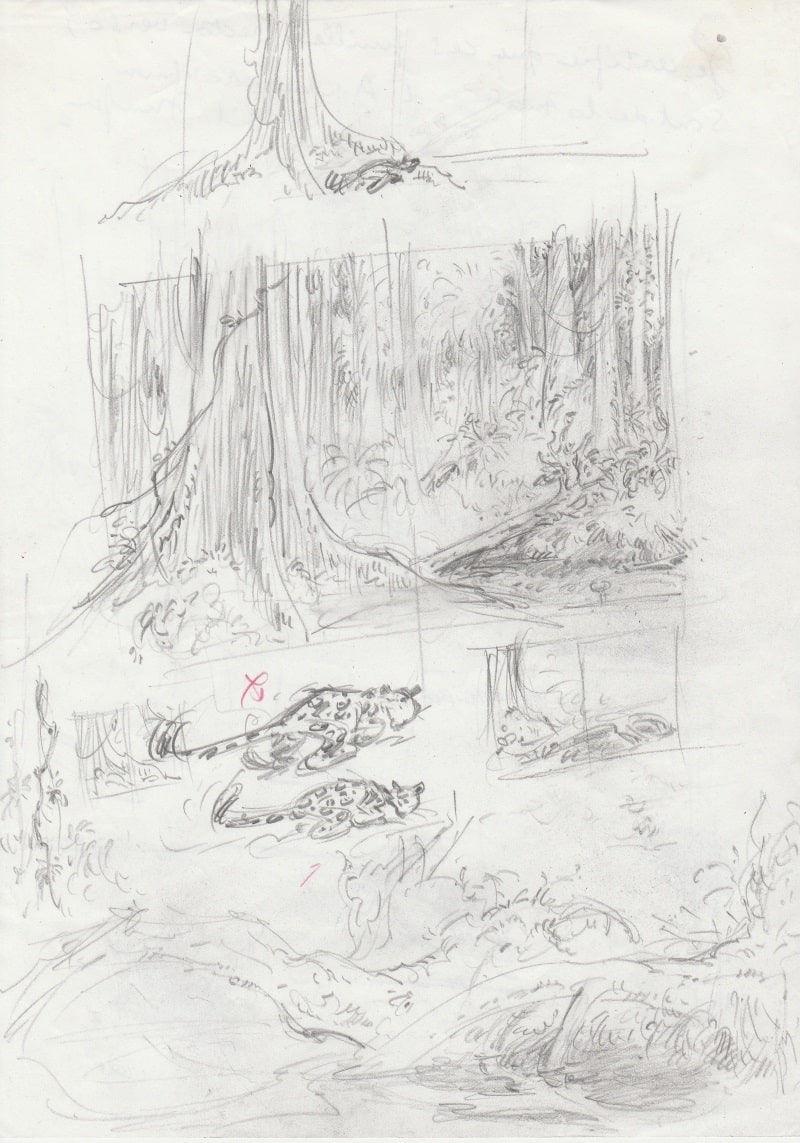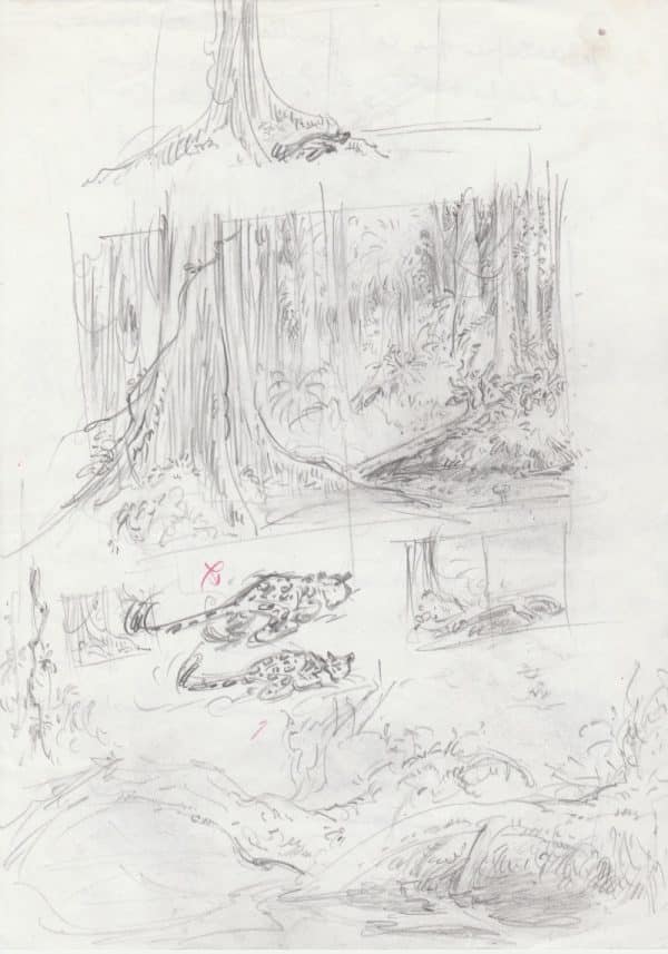 Dessin préparatoire à la couverture, à des attitudes de personnages et à des décors du deuxième album du Marsupilami (Marsu Productions) afin d’aider Batem, dessinateur de l’album.
