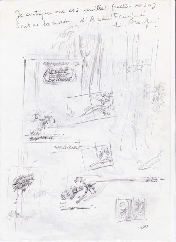 Mine de plomb sur papier recto/verso, 29,5 x 21 cm. Mention manuscrite de la veuve de l’artiste, Liliane Franquin, attestant l’authenticité du dessin.