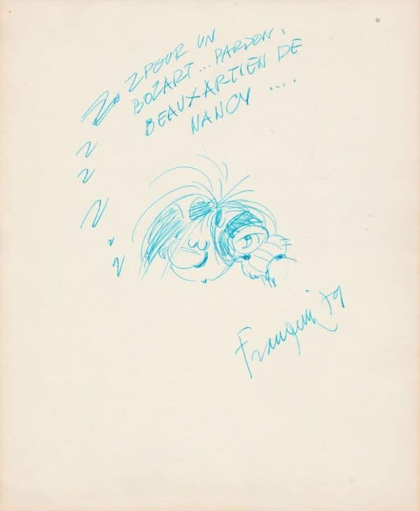 Encre bleue sur feuille cartonnée daté, signé et dédicacé : « ZZZZZZ Z Pour un Bozart…Pardon, Beaux Artien de Nancy…. », 25,5 x 21 cm.